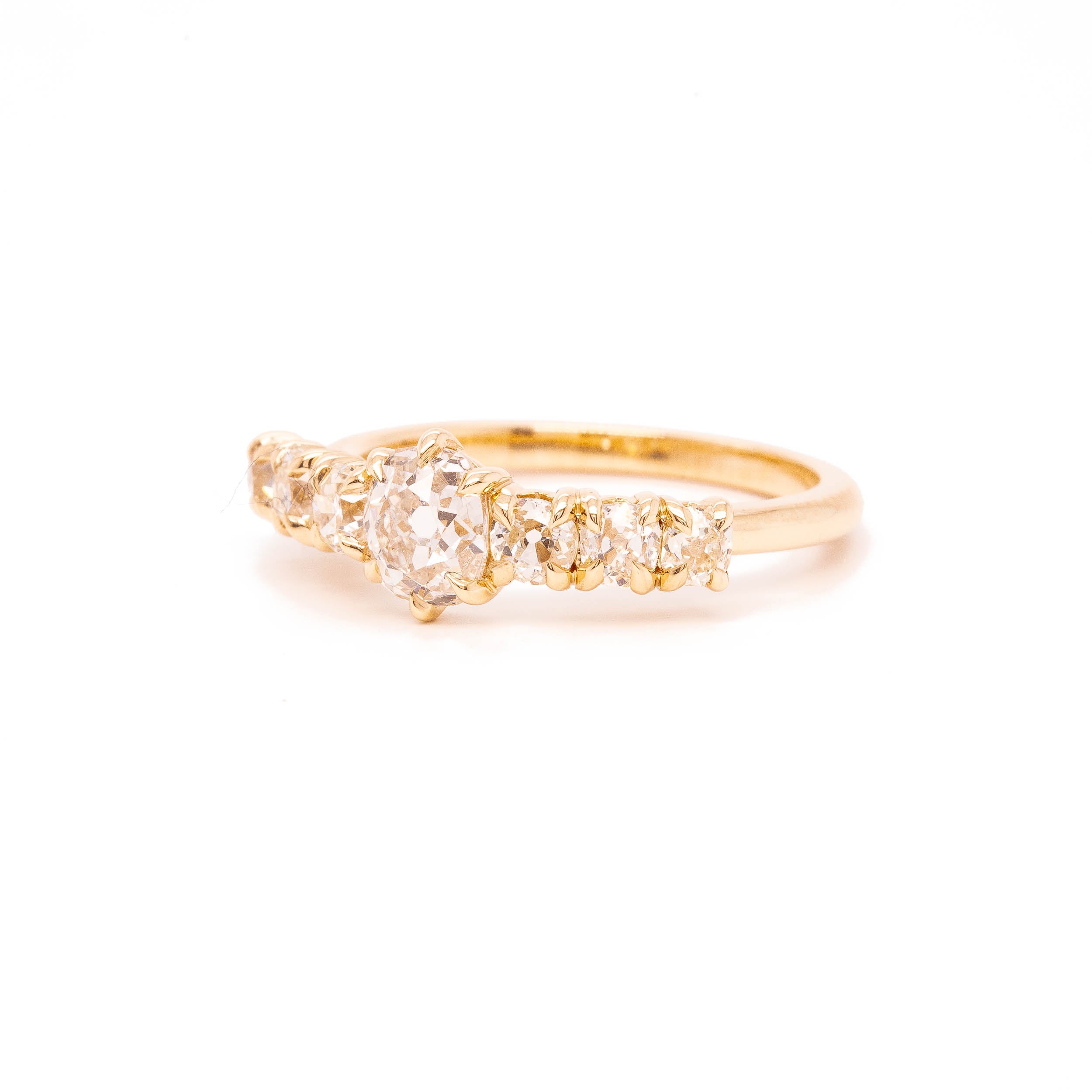 Seven sweet old mines set is plump claw prongs all in a row. Dainty in scale with a charming antique sparkle and low to the finger.