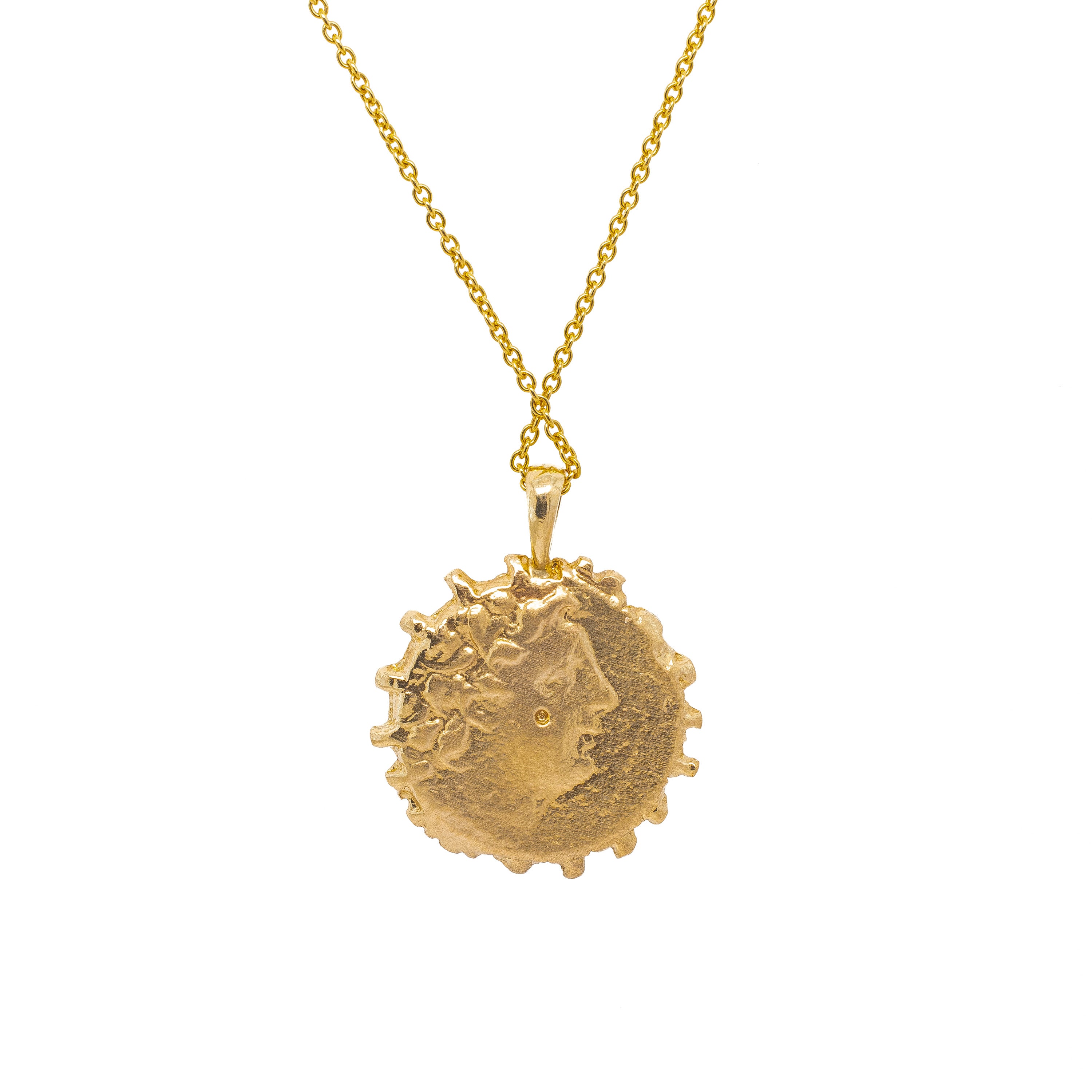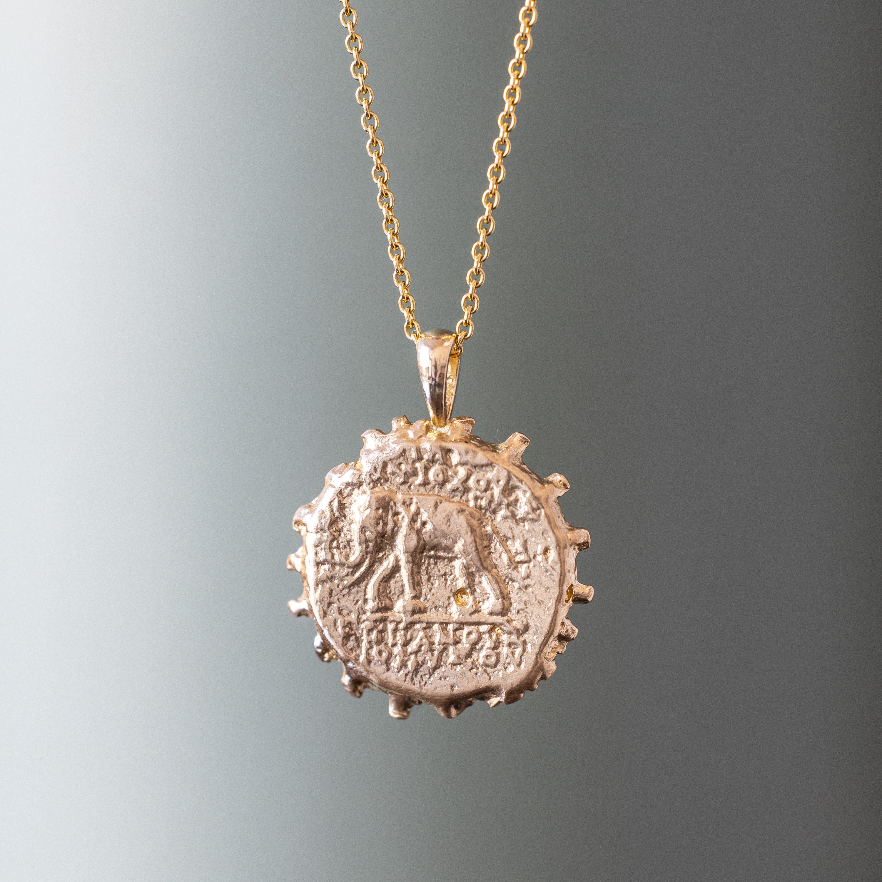 This coin was molded from an ancient silver coin and is a solid 14k gold replica, does NOT include chain.