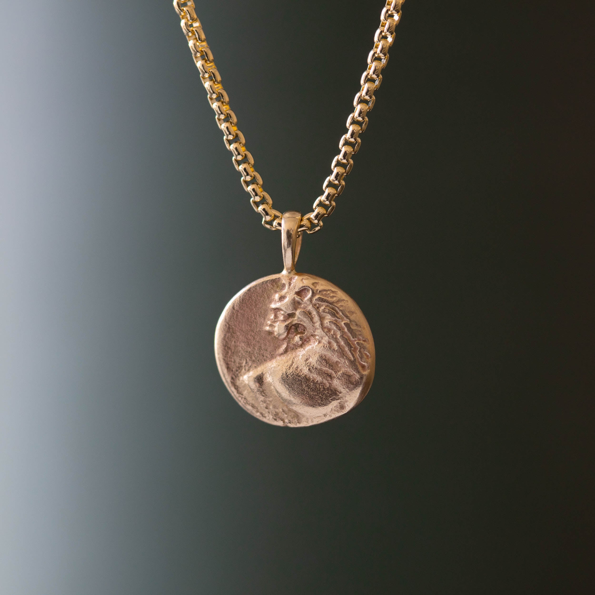 This coin was molded from an ancient silver coin and is a solid 14k gold replica, does NOT include chain.