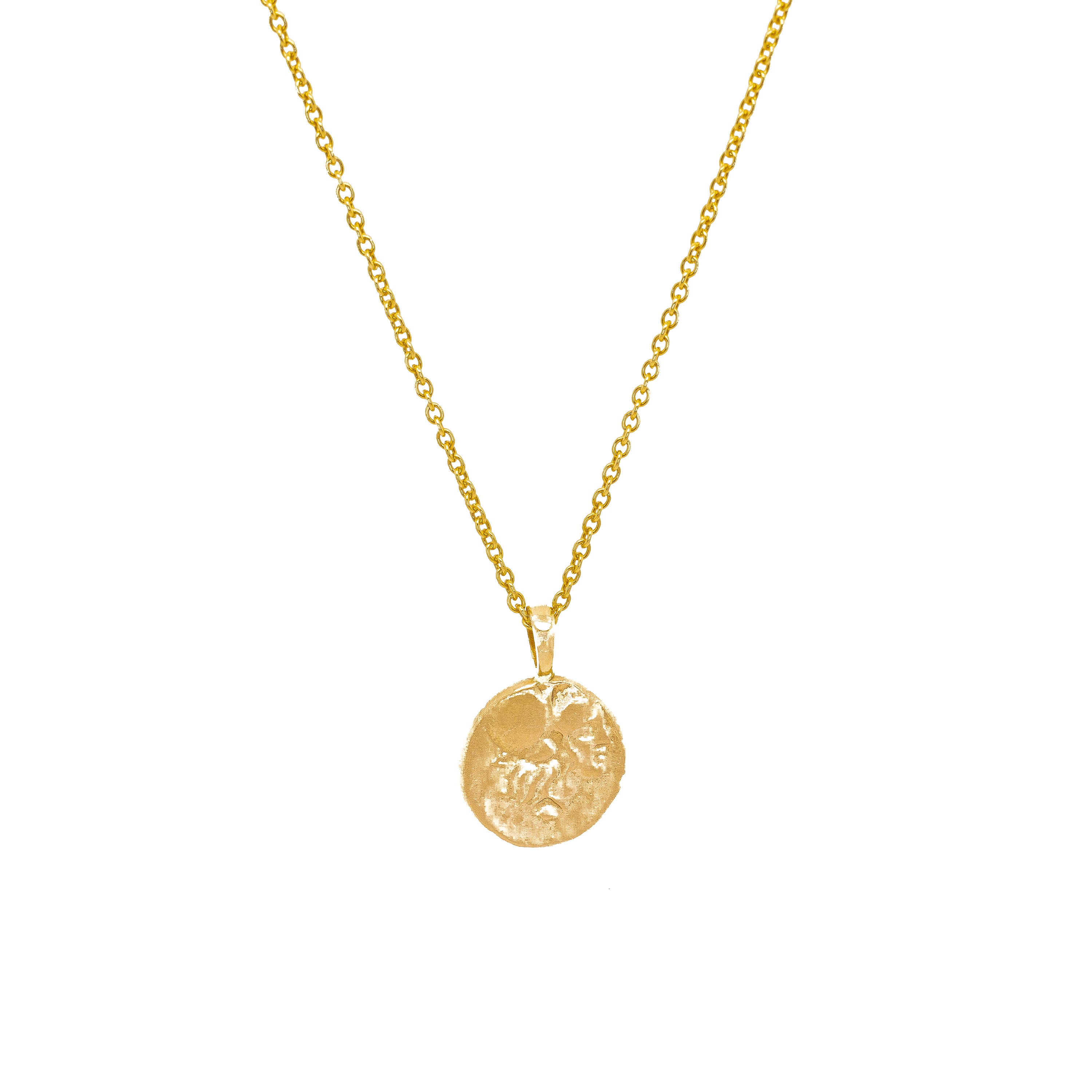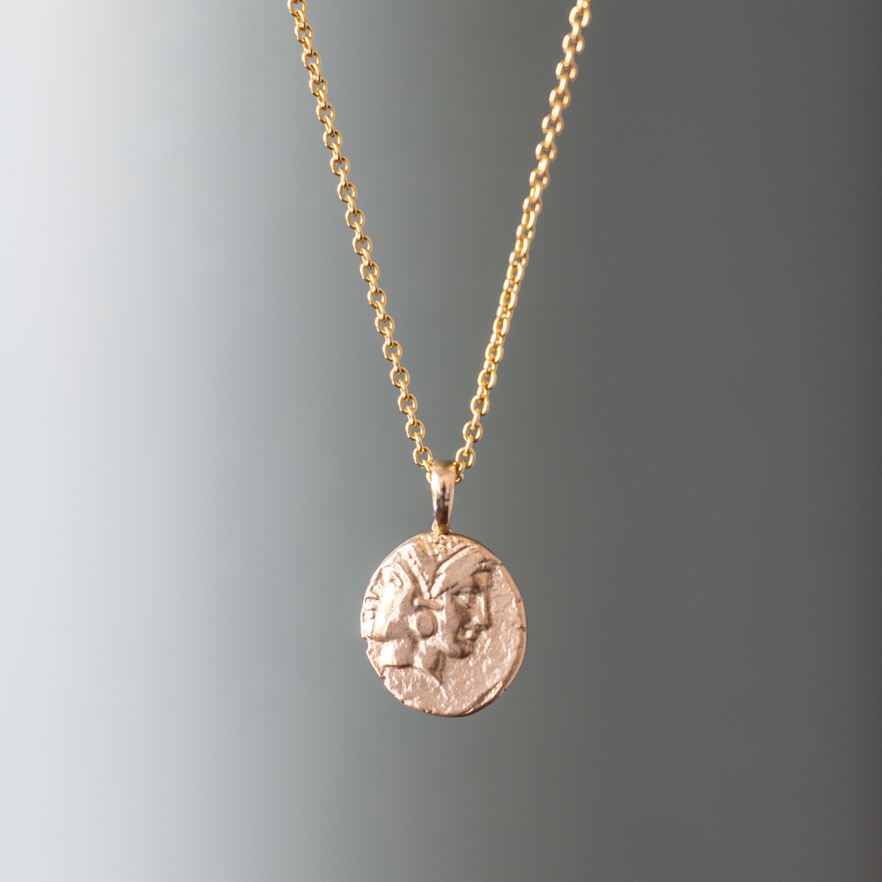 This coin was molded from an ancient silver coin and is a solid 14k gold replica, does NOT include chain.