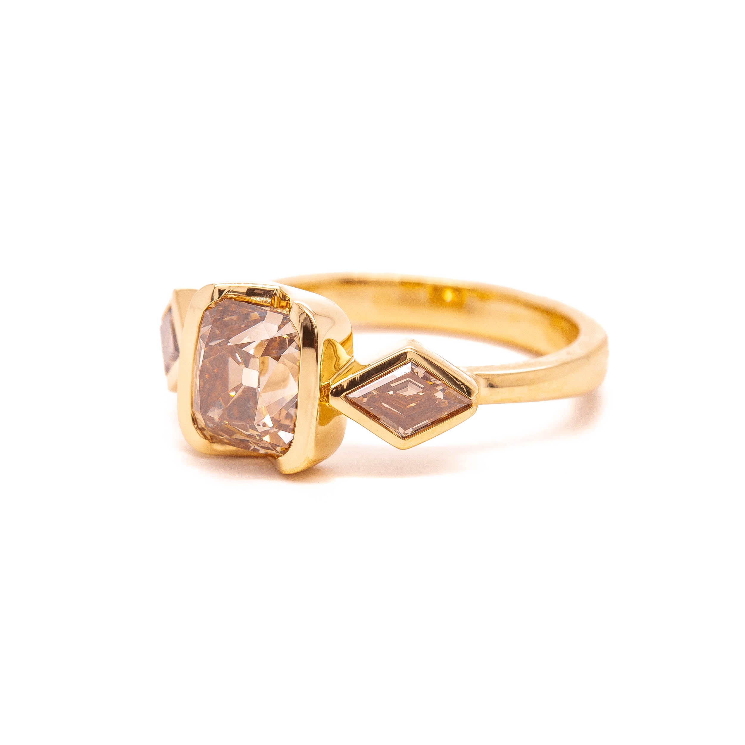 A lush warm ring with generous proportions and a chunky crown on the old mine center stone paired with equally tonal lozenge side diamonds and rich 18k yellow gold half bezels.