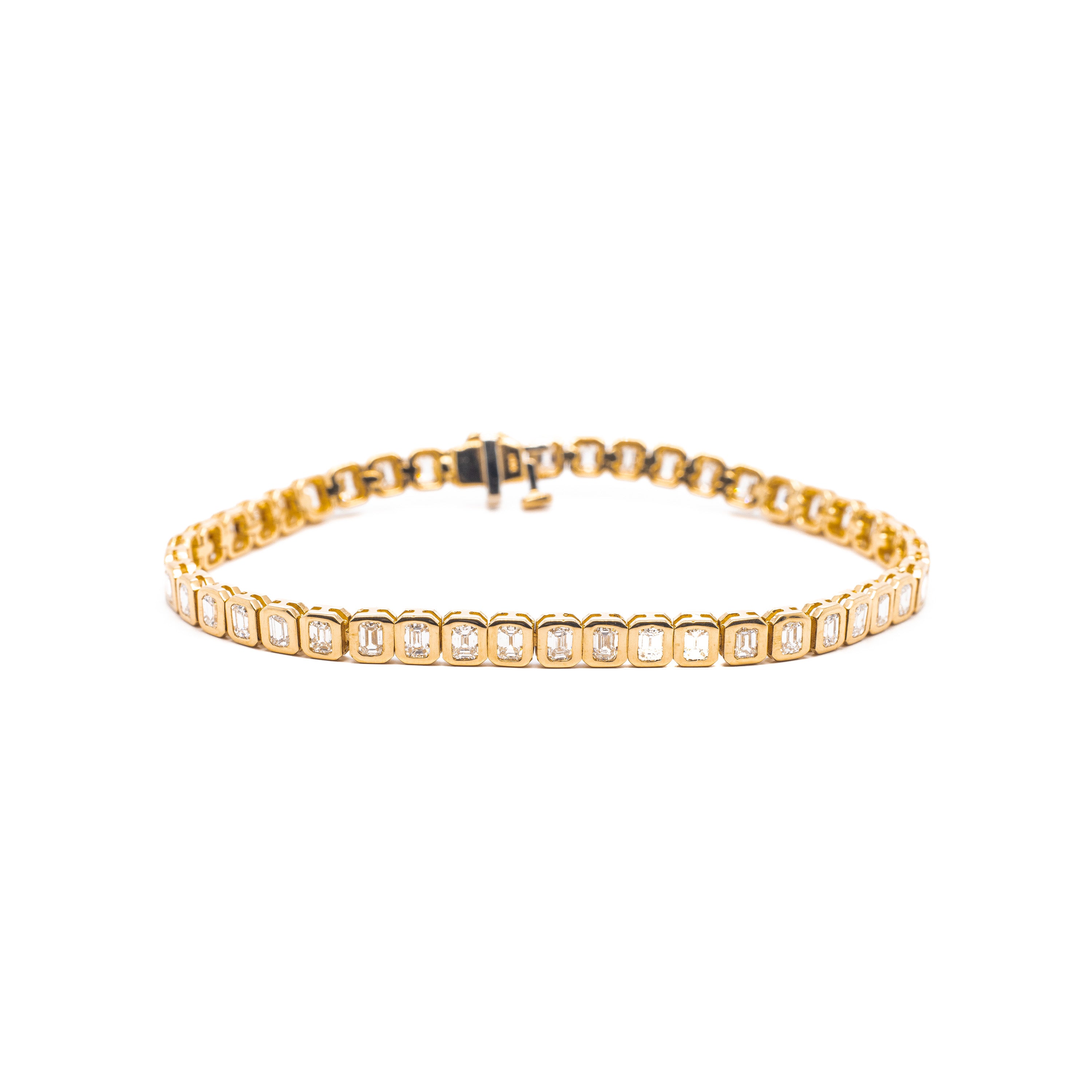 Full bezel emerald cut diamonds in a beautifully bold square tennis bracelet.