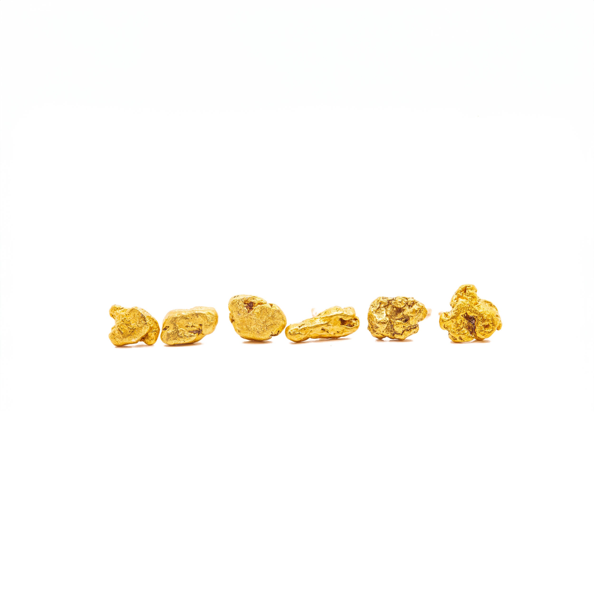 These one of kind single gold nugget stud earrings were panned for on the North Fork of the American River in California gold country. Each piece shows its unique alluvial history with individual river worn shapes.