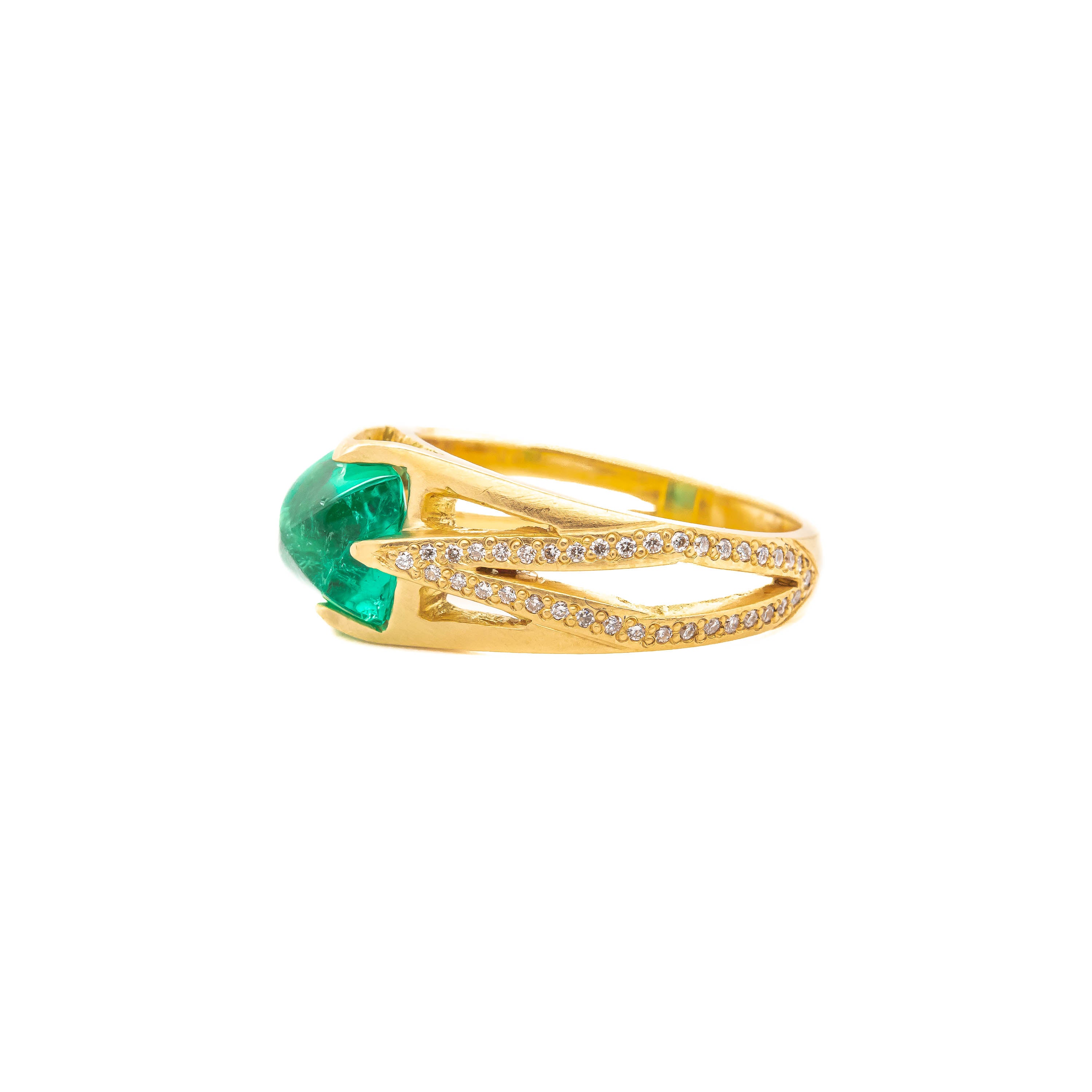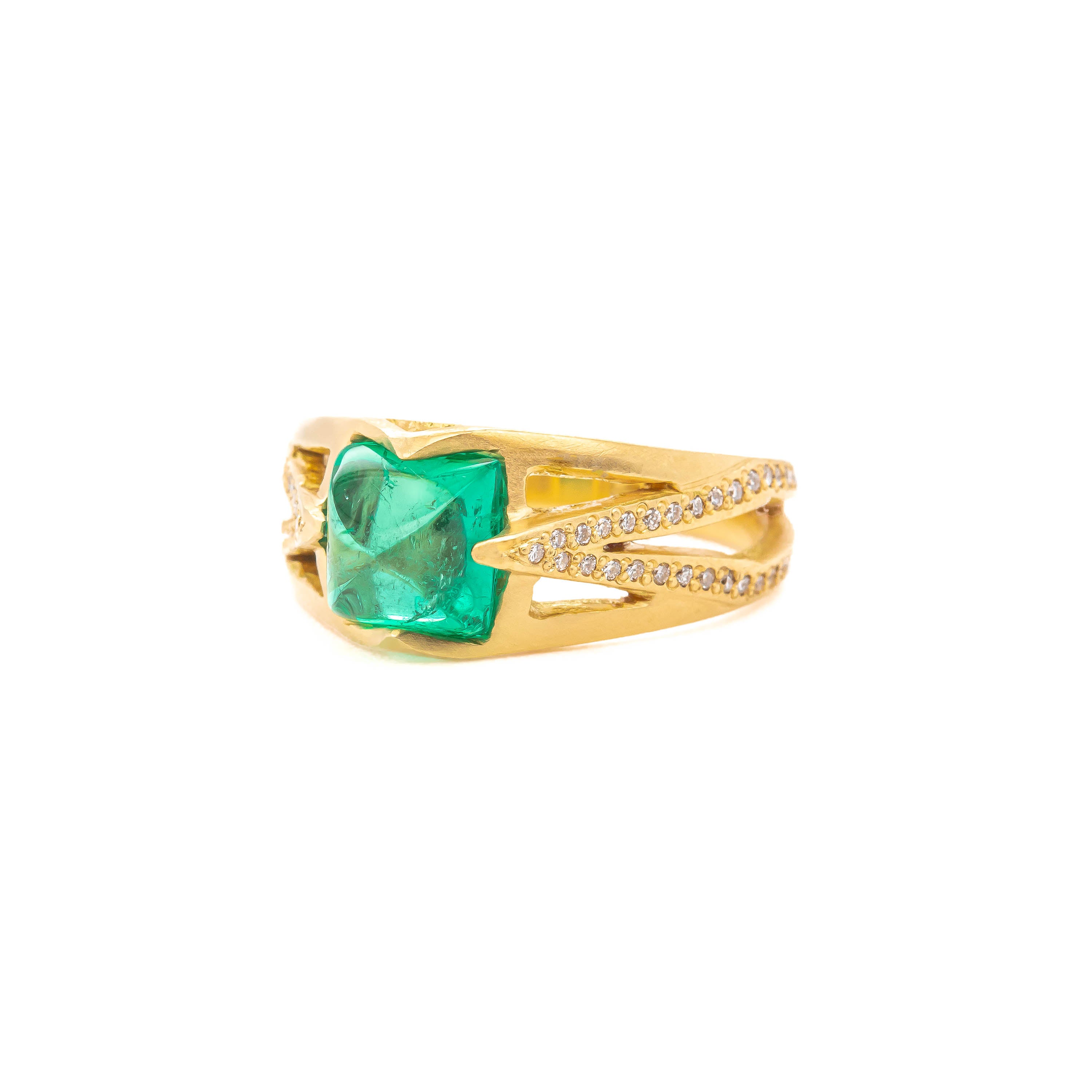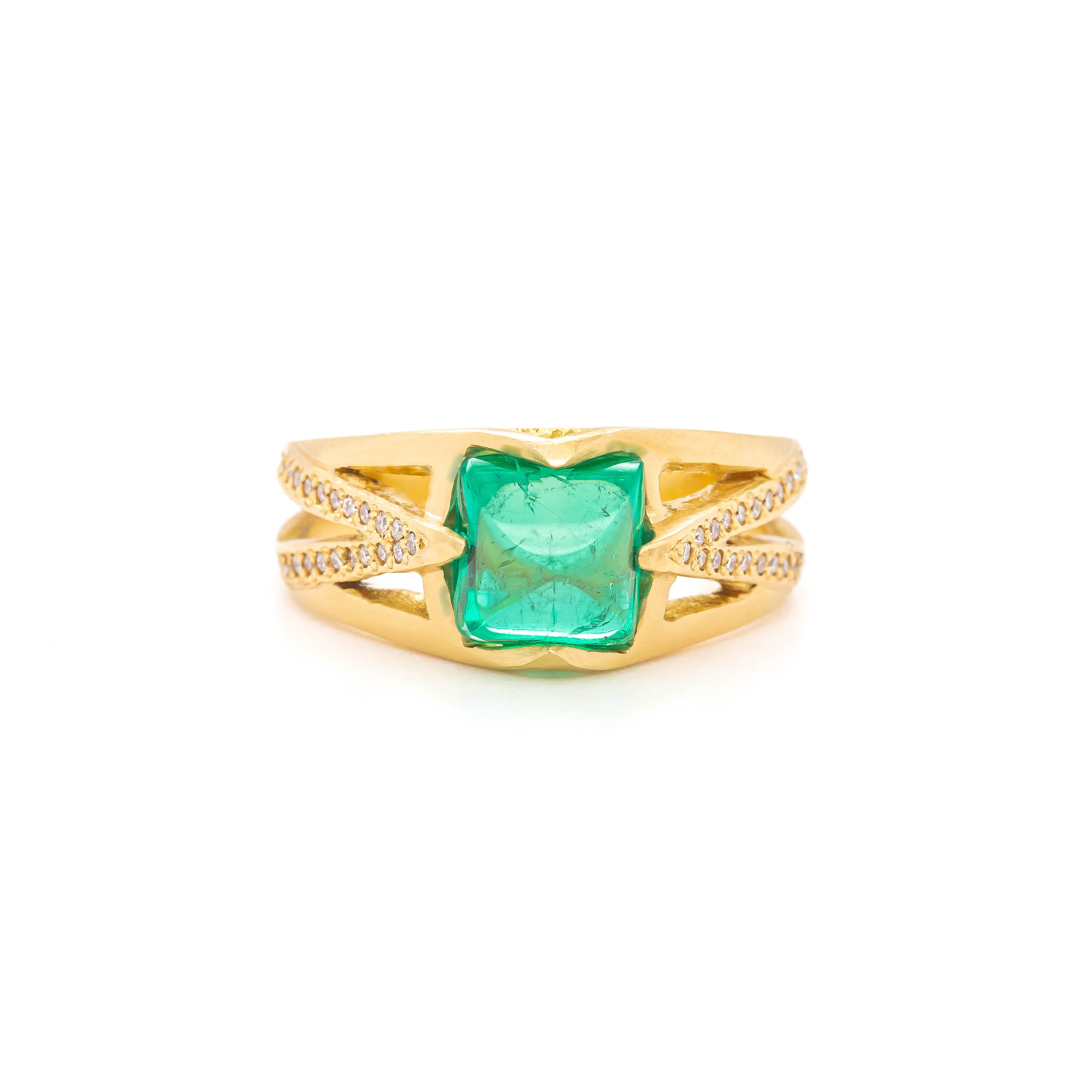 This 18k yellow gold ring features a punch of color in the form of a vibrant green antique sugarloaf emerald. Sparkling white diamond pavé accentuates the deco style band.