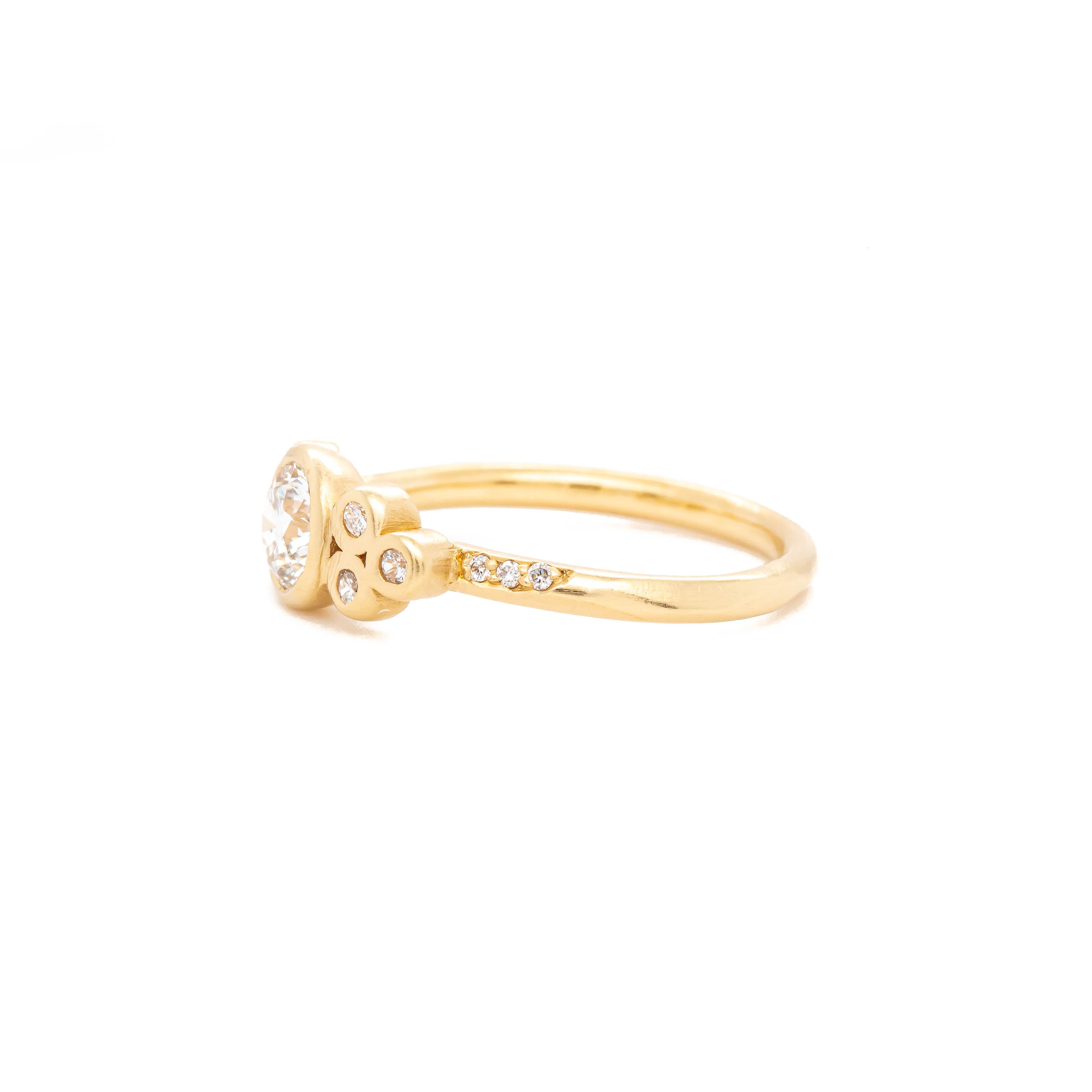 This playful ring features a sparkling white center stone hugged by two clover clusters of diamonds. A sprinkling of pavé on the gold band adds extra joy.