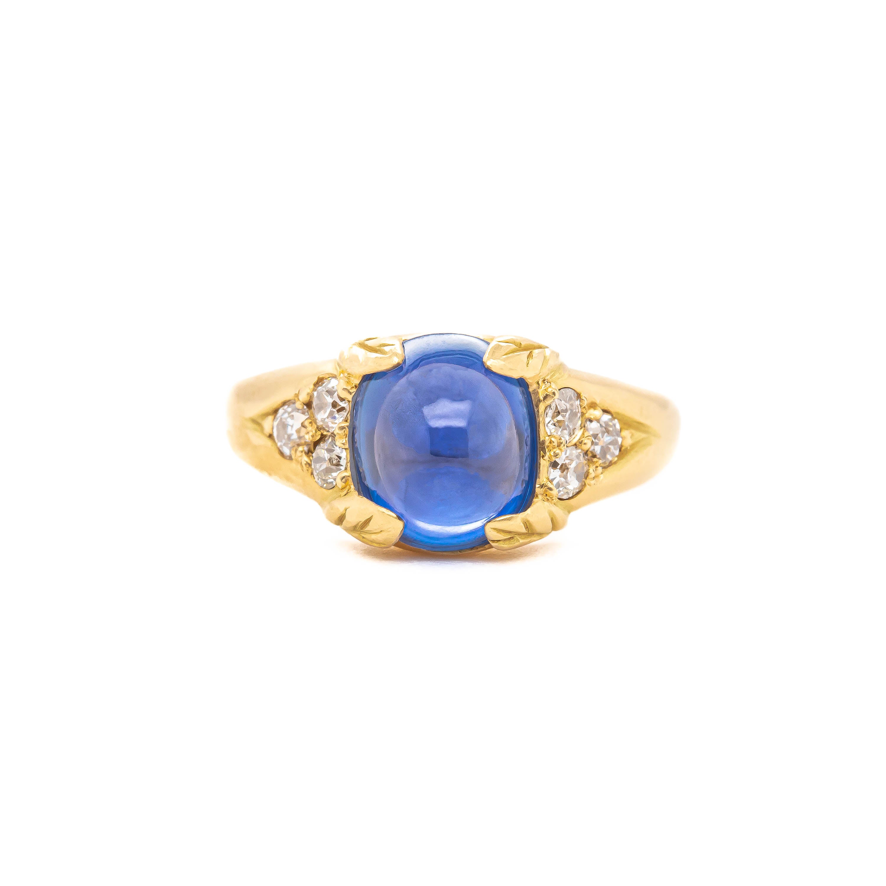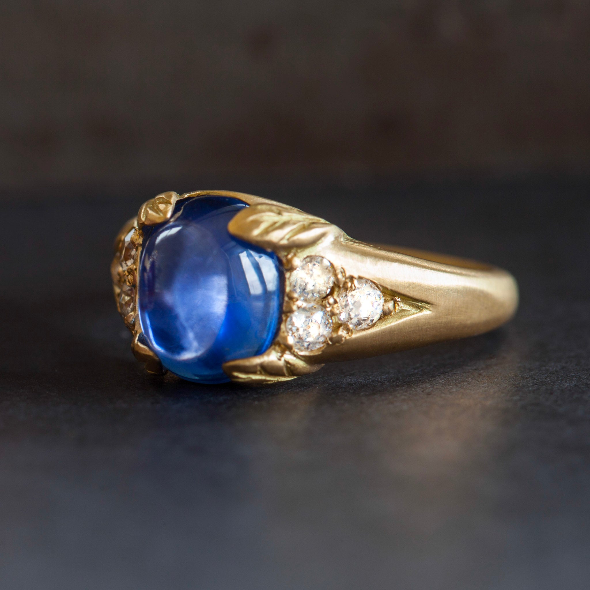 This antique sugarloaf sapphire cabochon glows in detailed leaf prongs. Rich, saturated 18k gold and old mine cut diamonds frame the stone and complete this gorgeous vintage-inspired, romantic design.