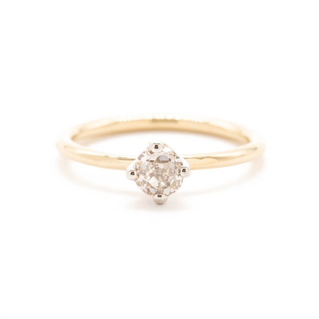 This beautiful solitaire features a unique Old Mine Cut diamond seated in a delicate prong setting with compass prongs on a high polished fancy pink/purple round faceted diamond held within a half bezel that leads into a delicate, fluid water band.