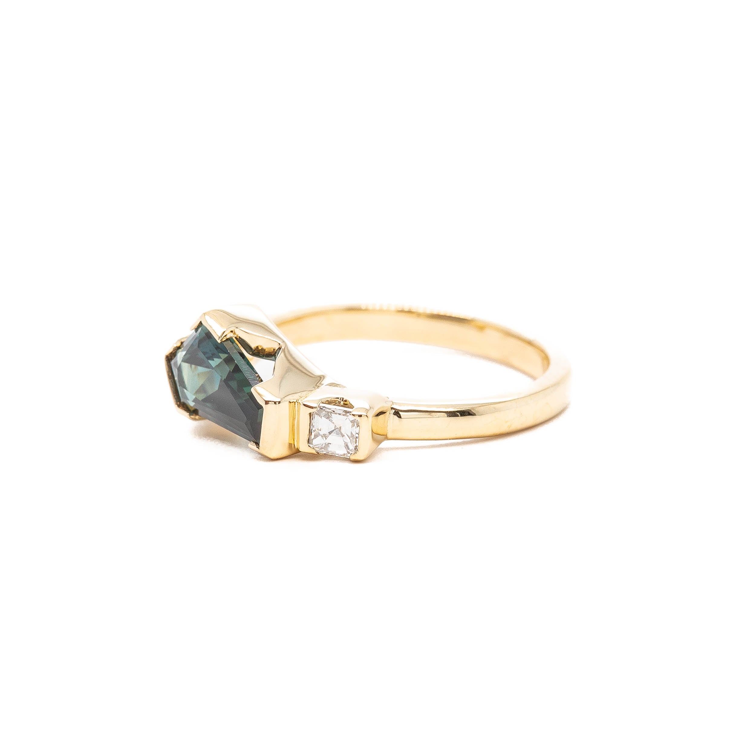 A deep blue abstract Australian sapphire is paired with lively carrè cut diamonds and bold geometric cutouts.