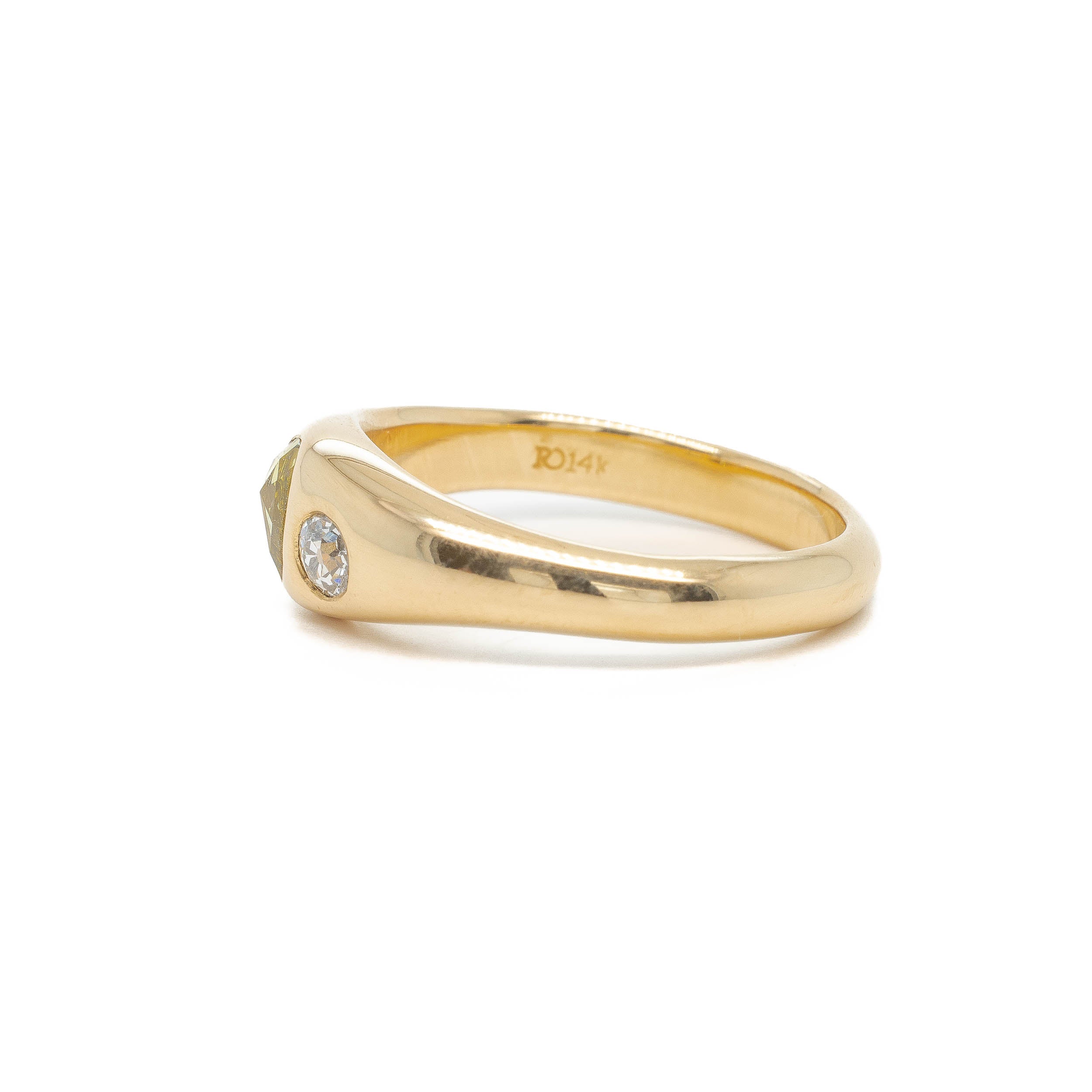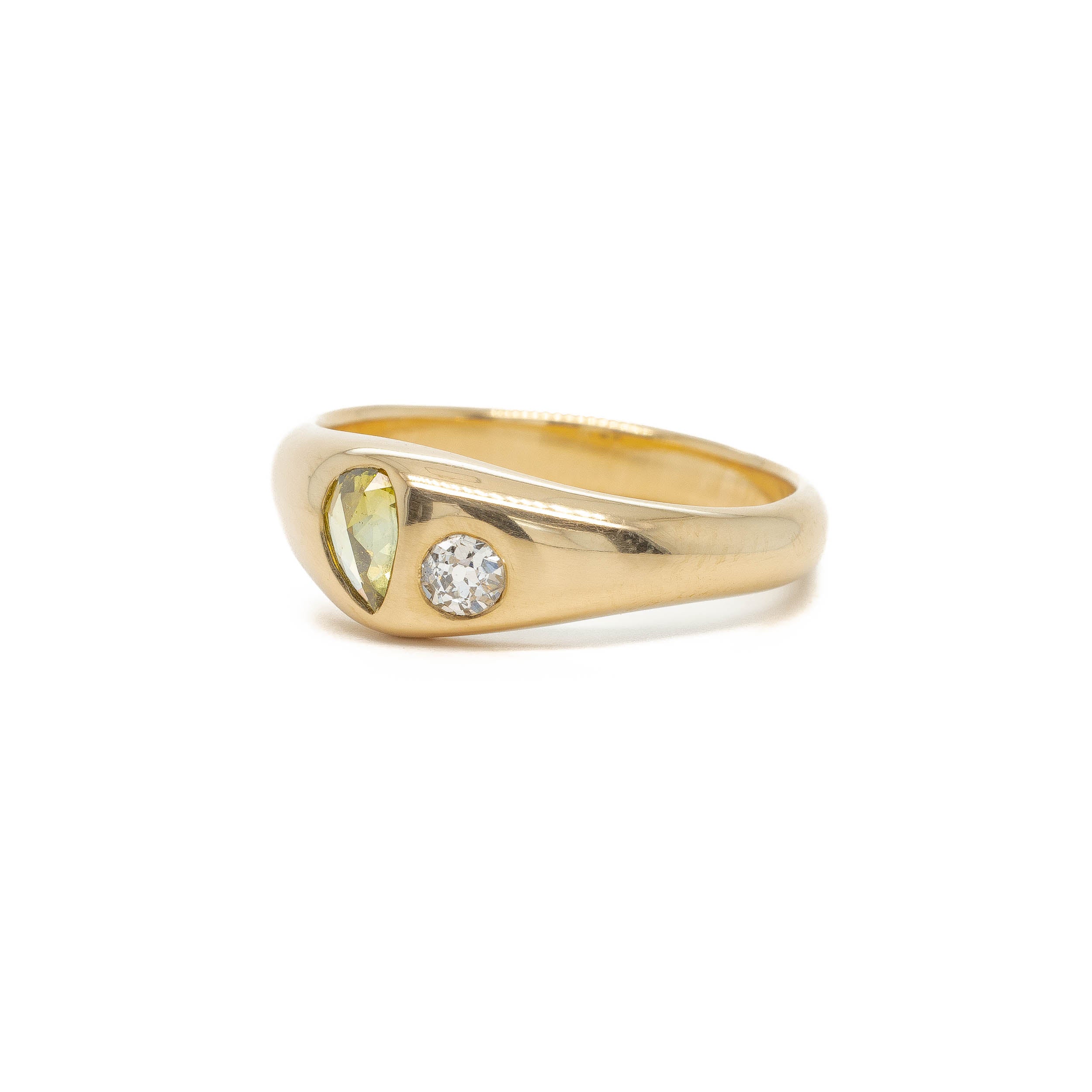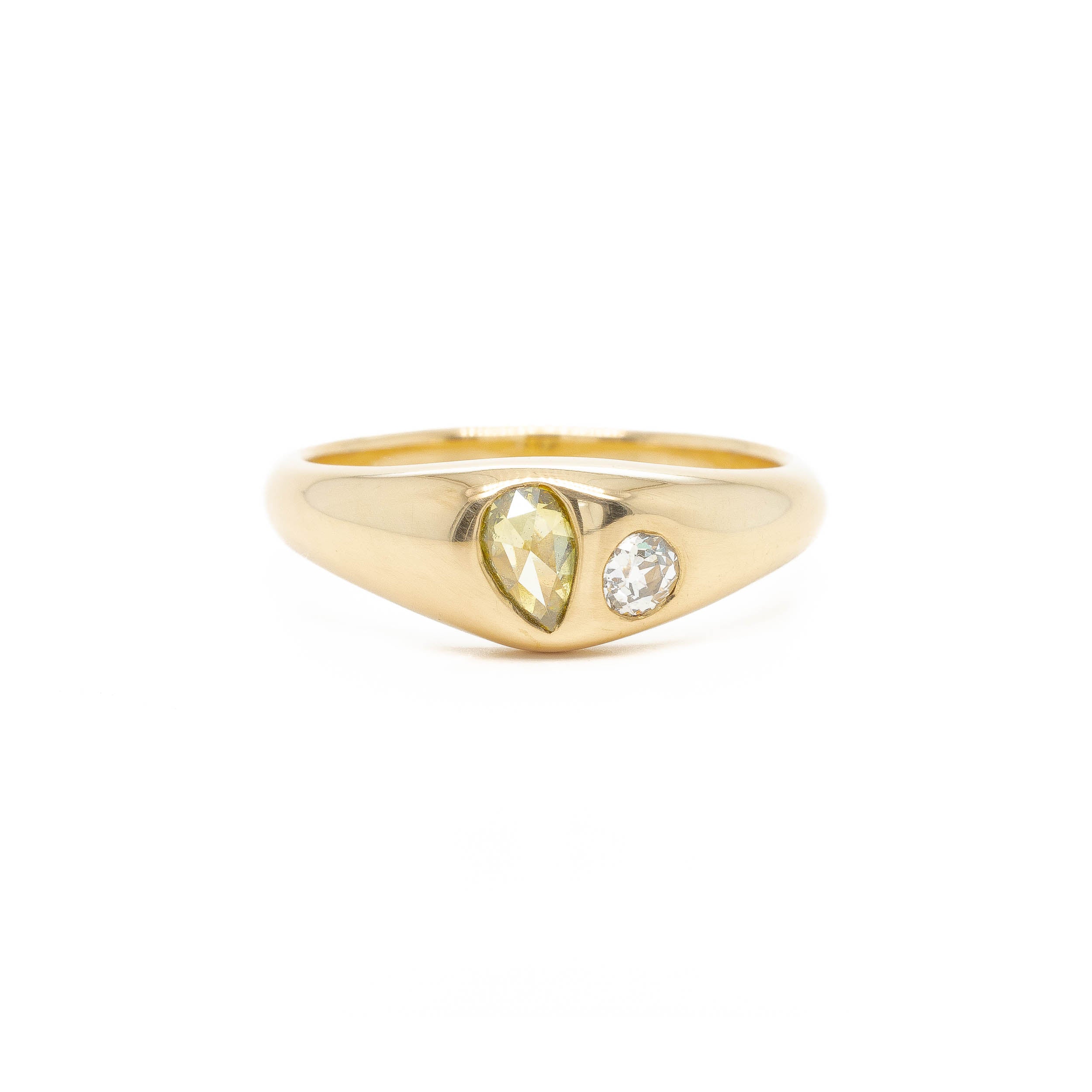 Sitting smooth and low to the finger, this unlikely pairing, a green rose cut pear and old mine, are flush set into this sumptuous hand carved gold band.