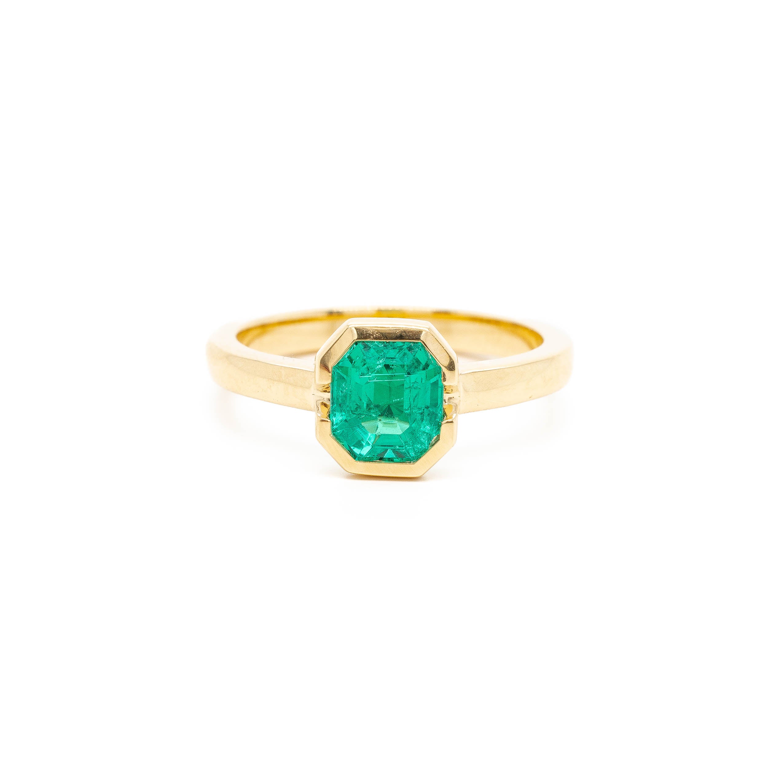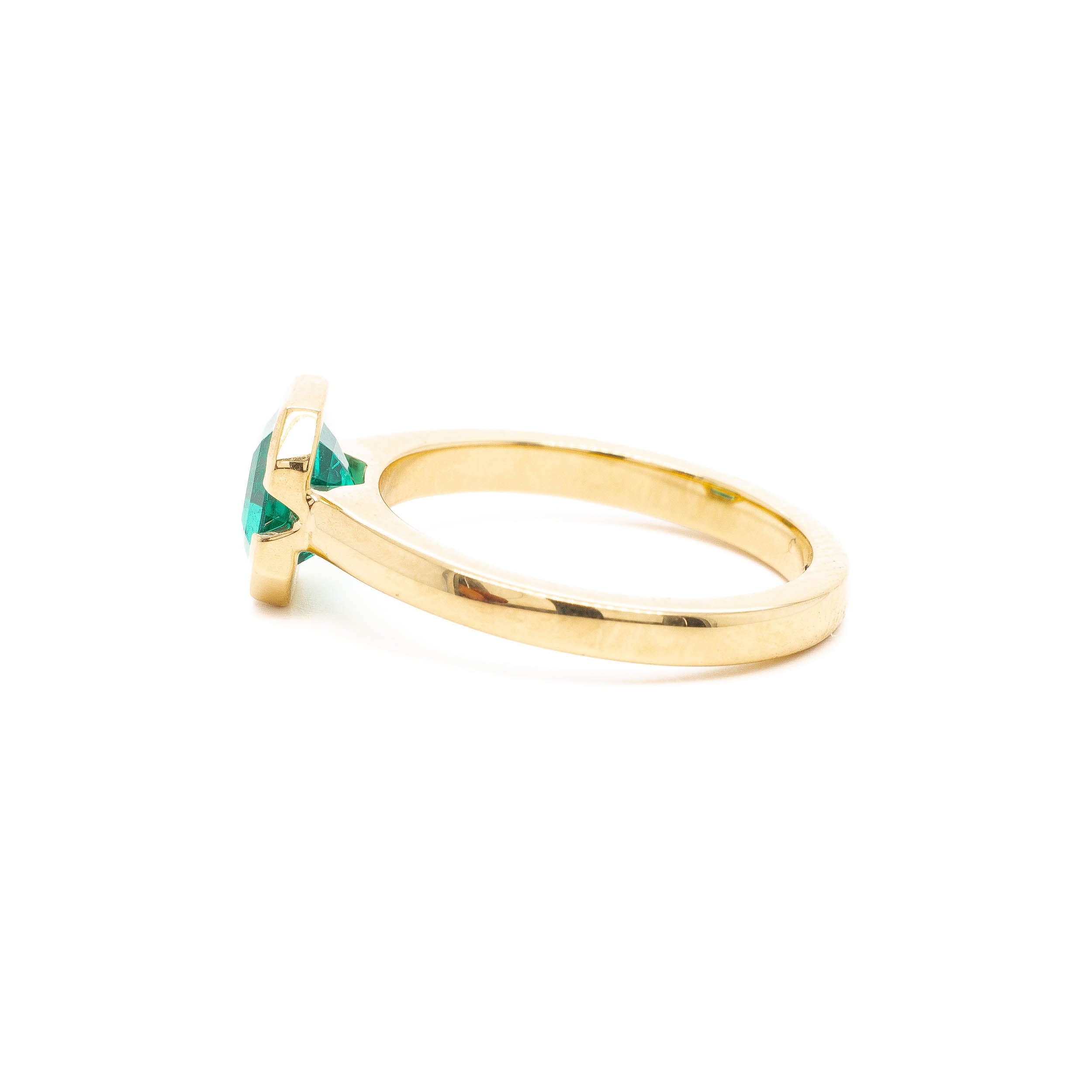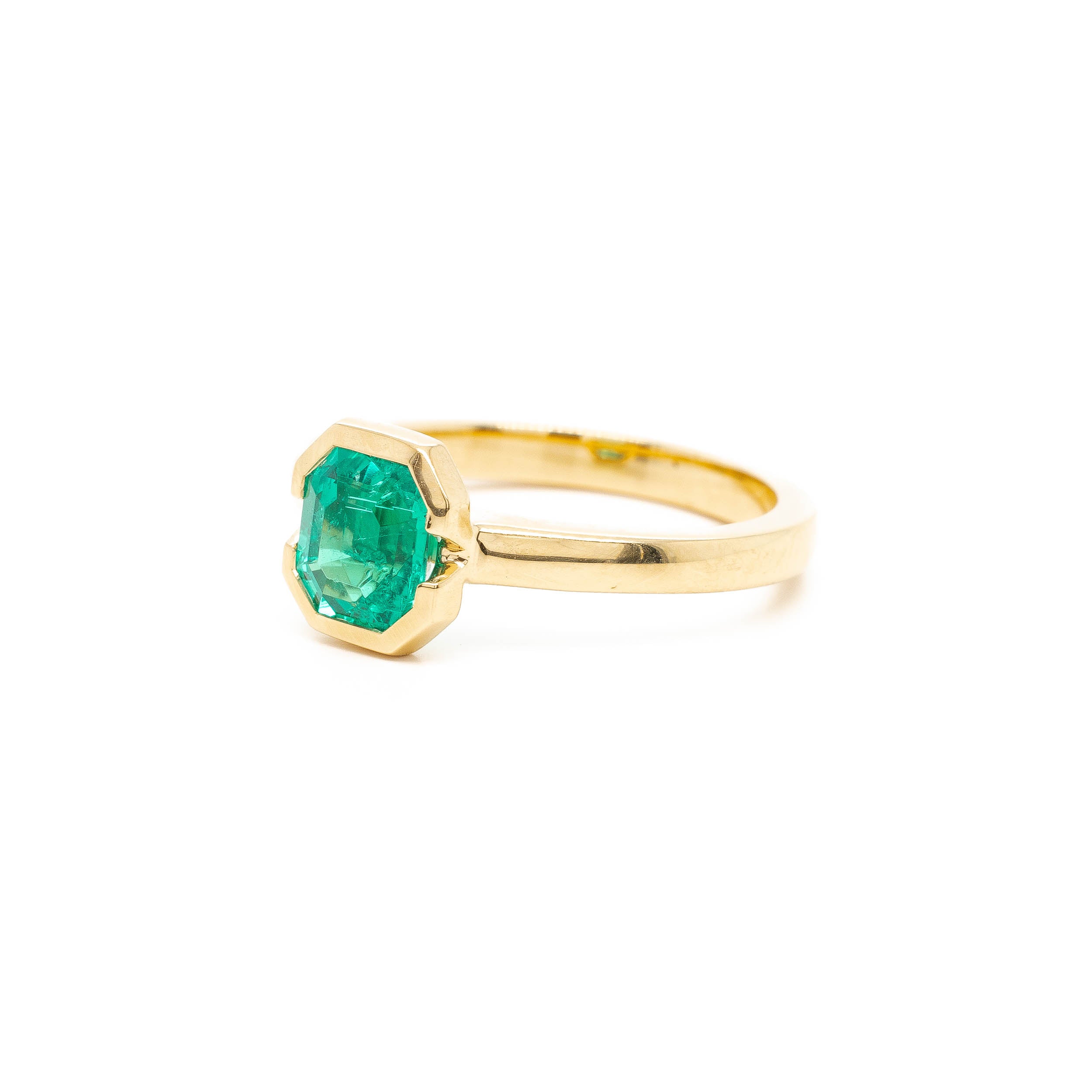This emerald is a captivatingly vivid glowing green. An rare antique Colombian emerald we have set it in a protective half bezel in warm 18k yellow gold. The perfect solitaire for an emerald lover.