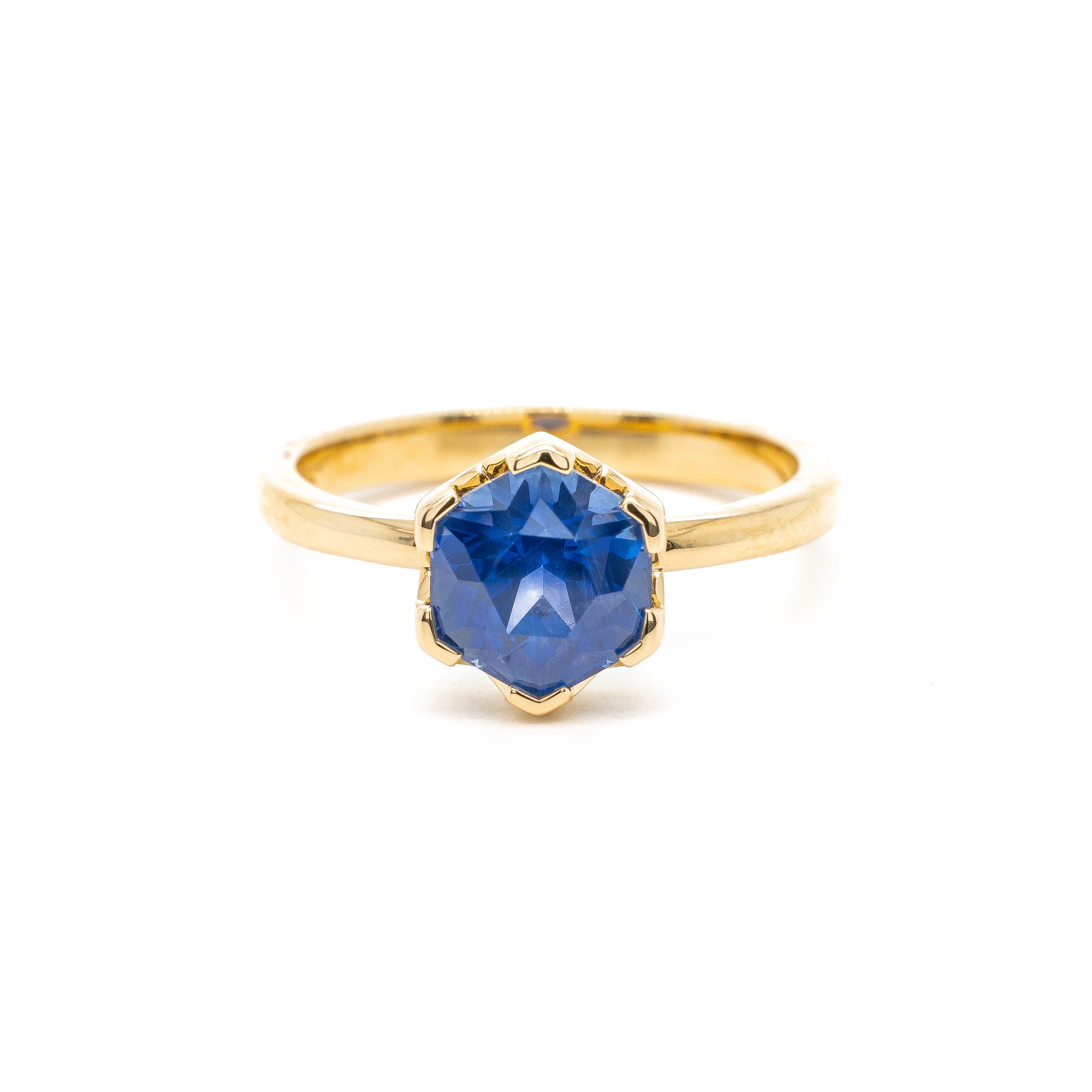 Deep silky blues set this Montana sapphire apart from any we've seen before. A pleasing hexagonal shape, this stone was cut by Barbara Thomas in Portland. The warm 18k gold setting with crenellated tab prongs sets of this regal blue stone.