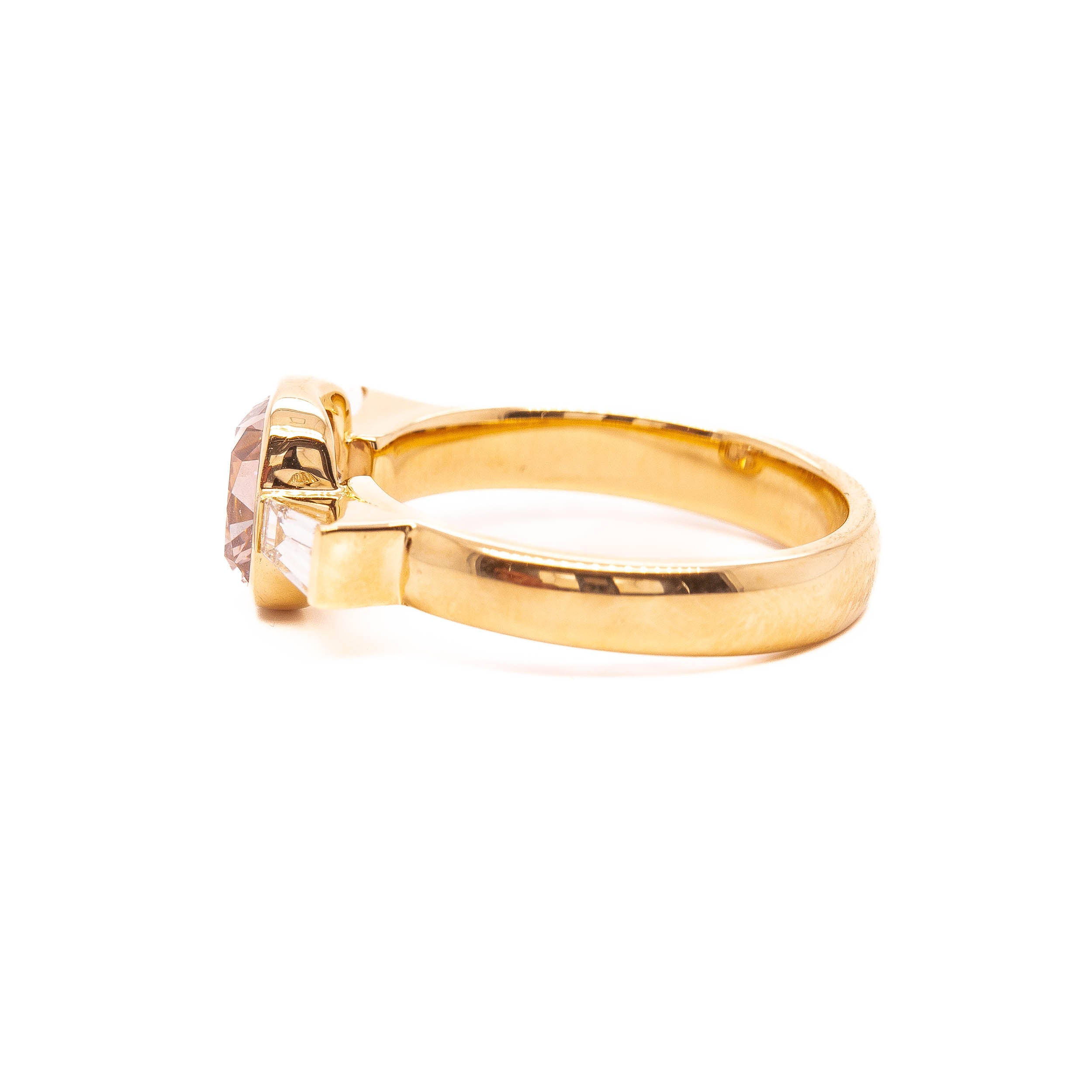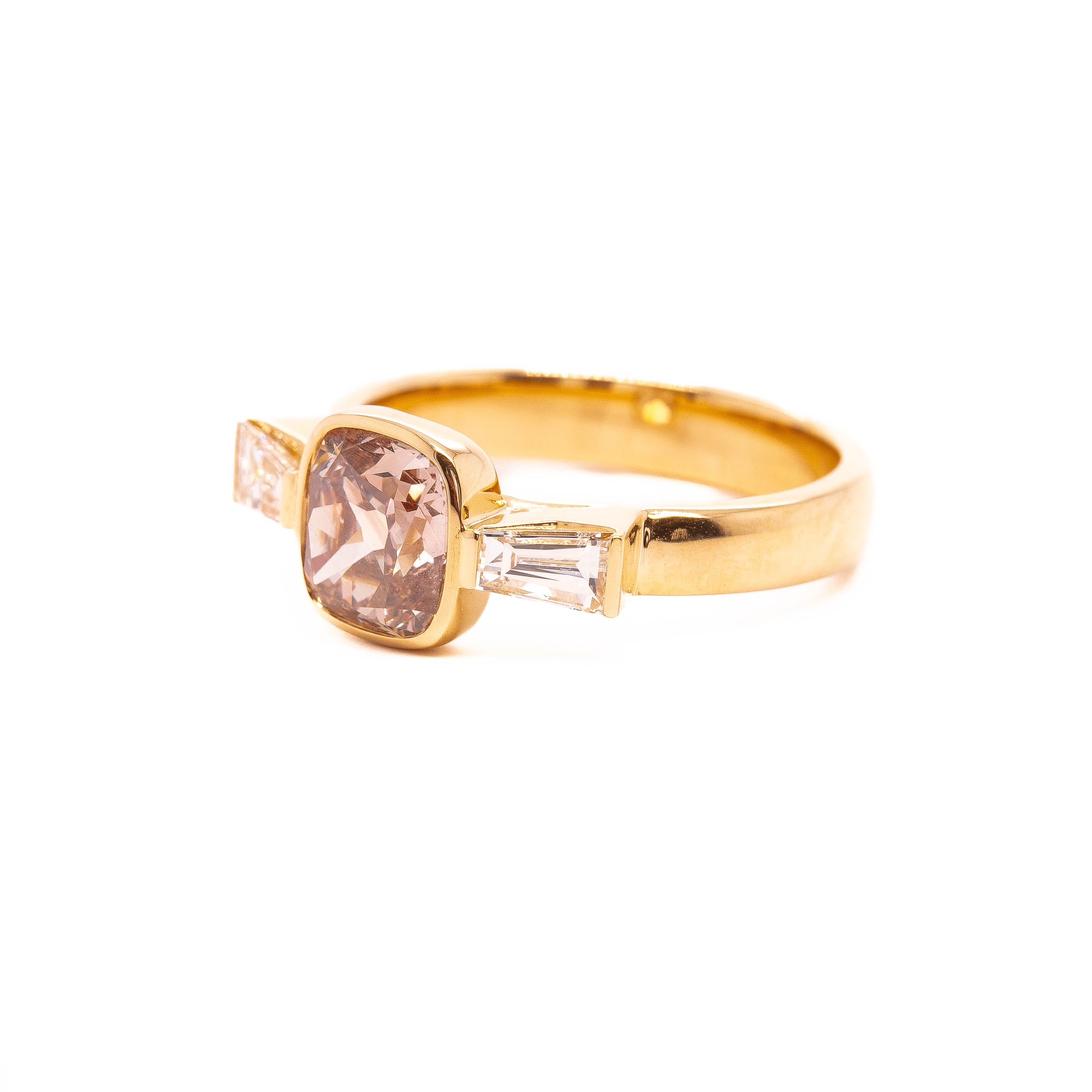 A warm lavender brown cushion diamond is flanked by tapered baguettes and lead into a chunky warm 18k band.