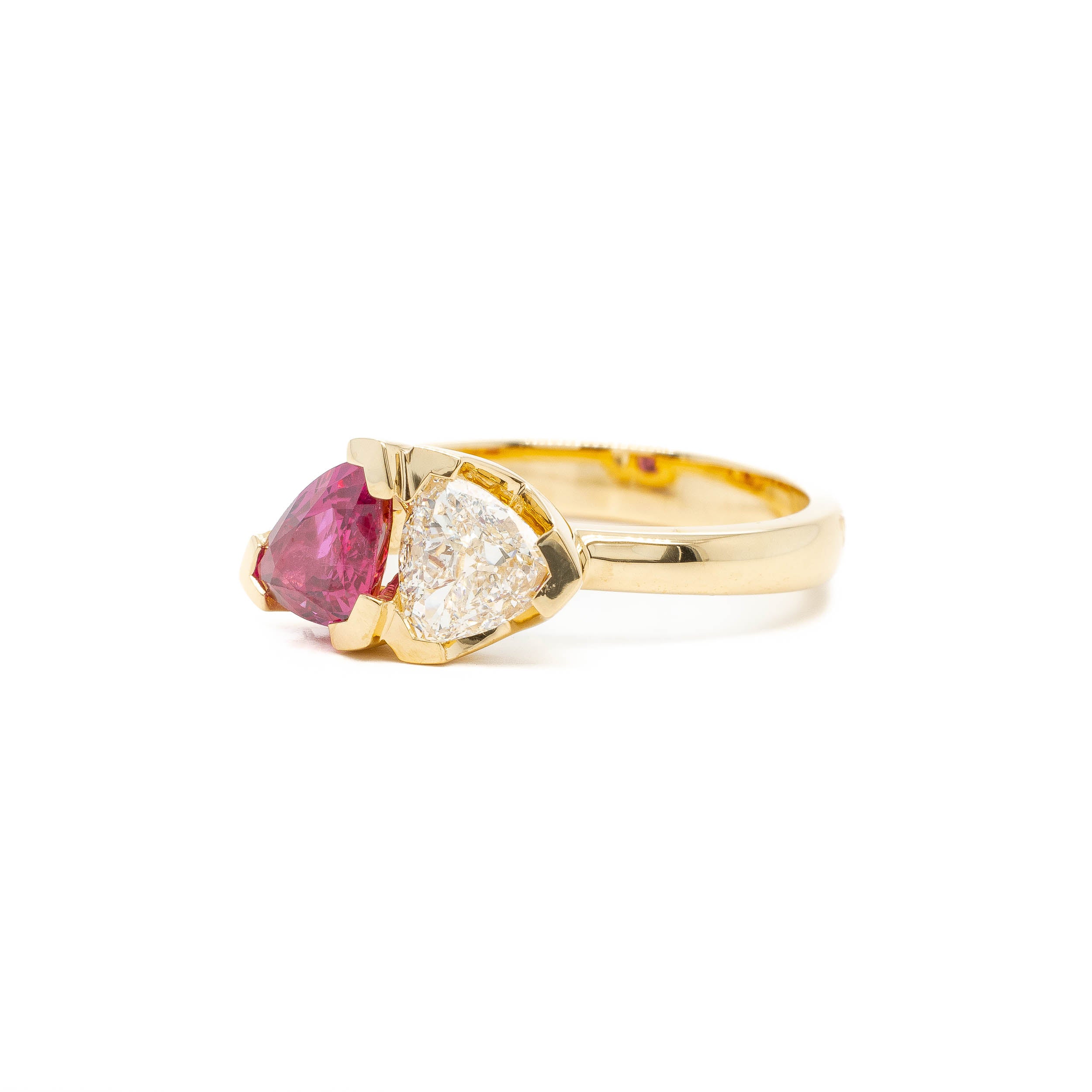 A beautiful elongated trillion shaped ruby is boldly paired with a sparkling trillion diamond, set with attractive tab prongs in warm 18k yellow gold.