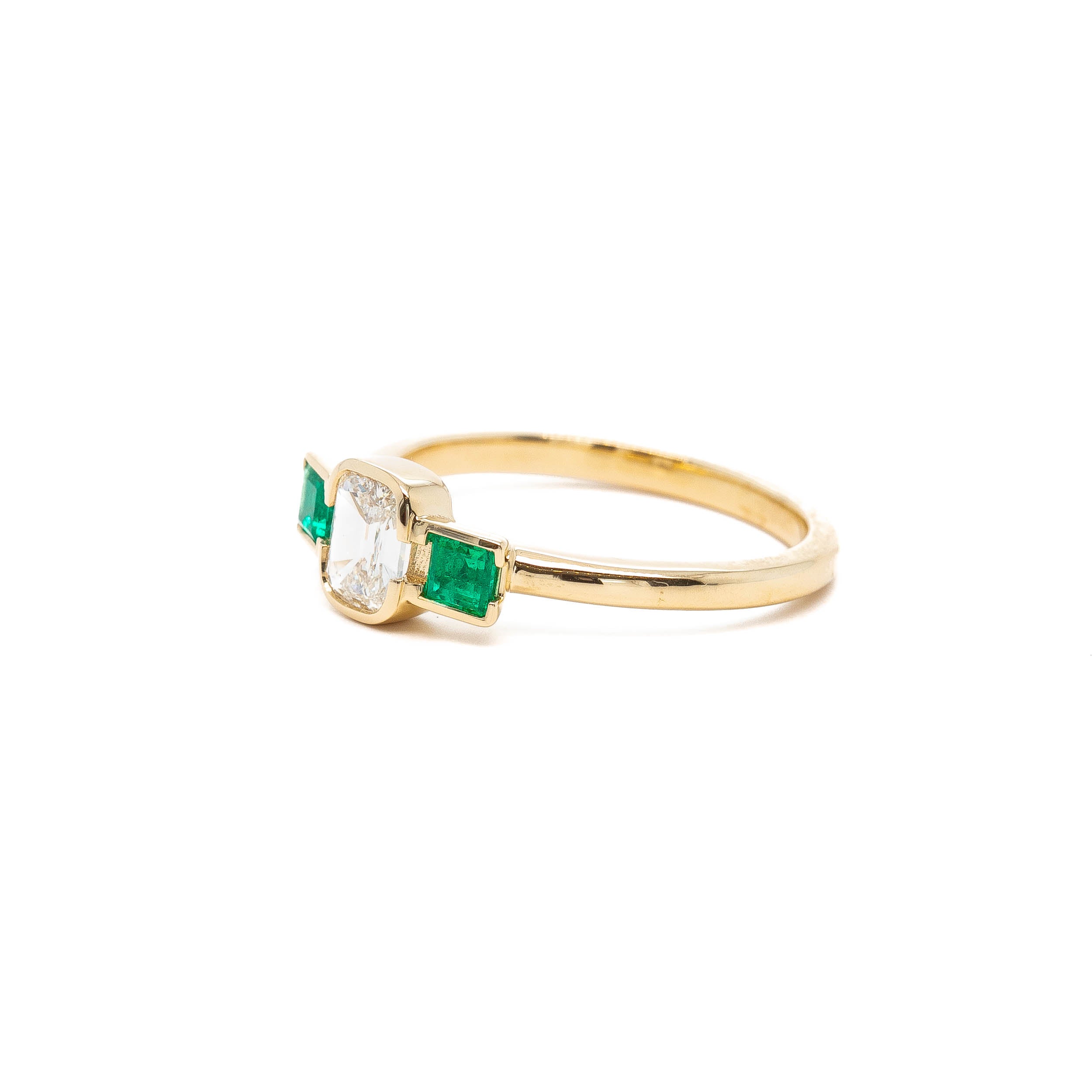A sparkling white antique inspired cushion diamond is set between vibrant green emeralds. This ring is dainty and perfectly detailed.