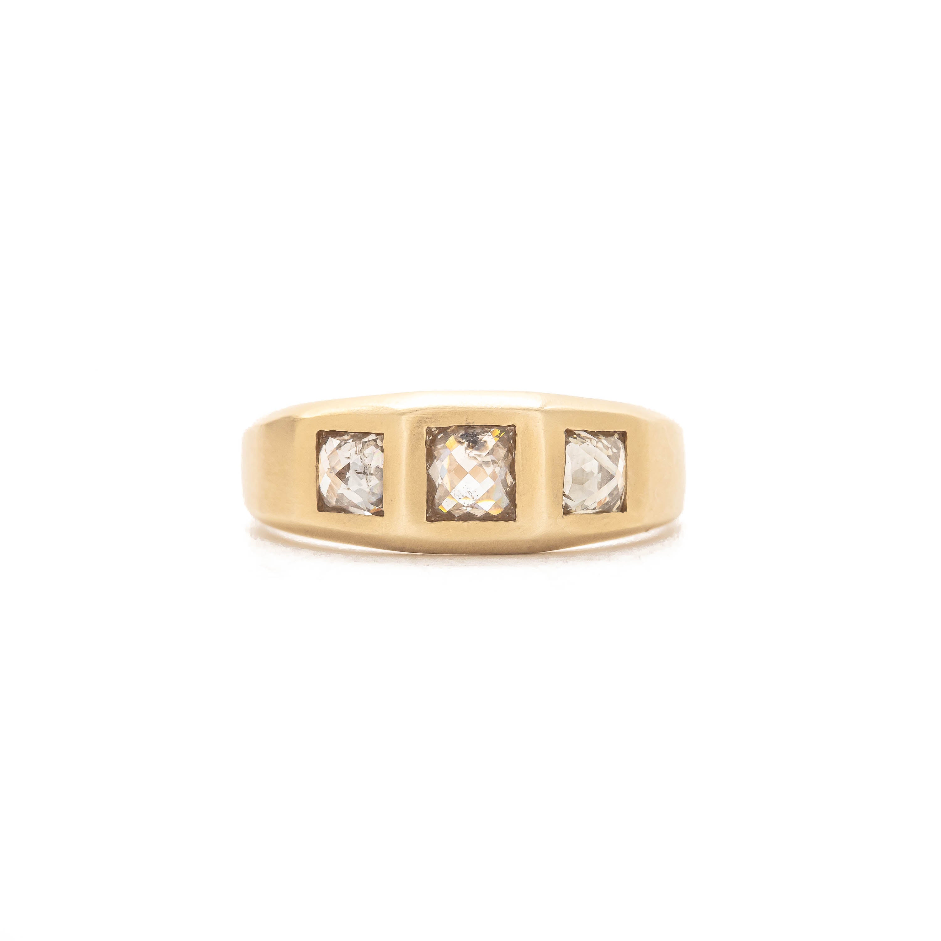 This ring showcases a trio of sublime princess cut champagne diamonds with elegance and simplicity in a wide, tapered gold band.