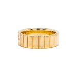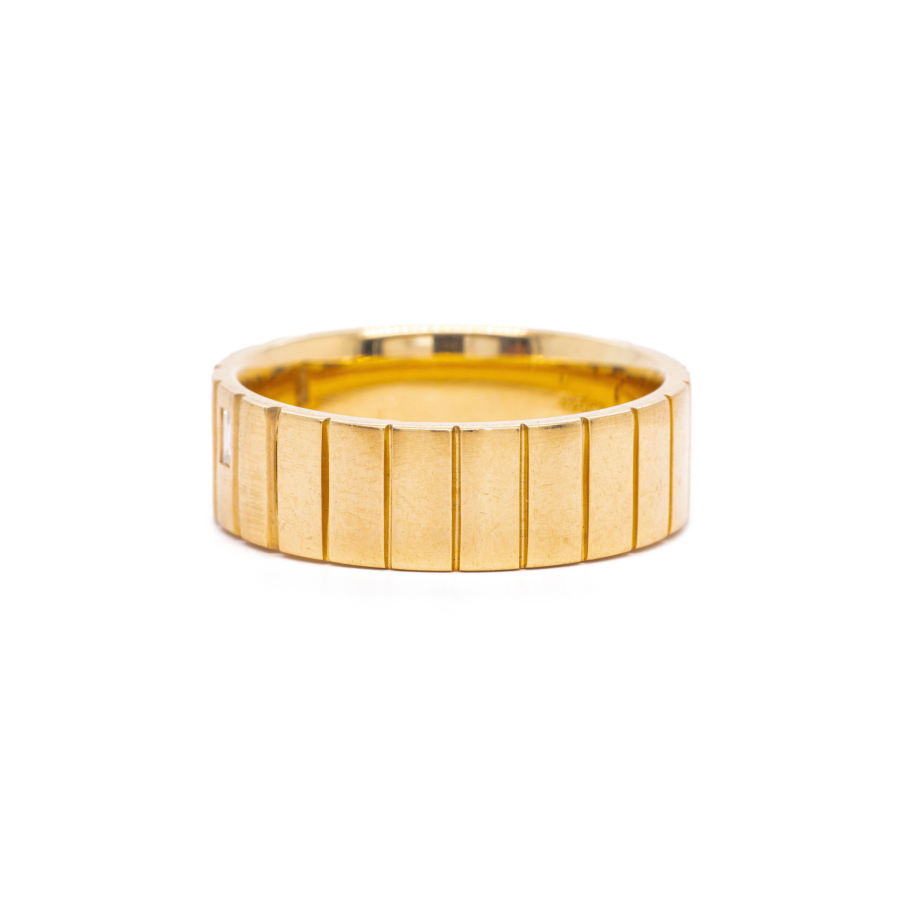 The Bar Band features a repeating pattern of hand-carved grooves for a subtle, linear texture with four baguette diamonds placed in a random pattern.