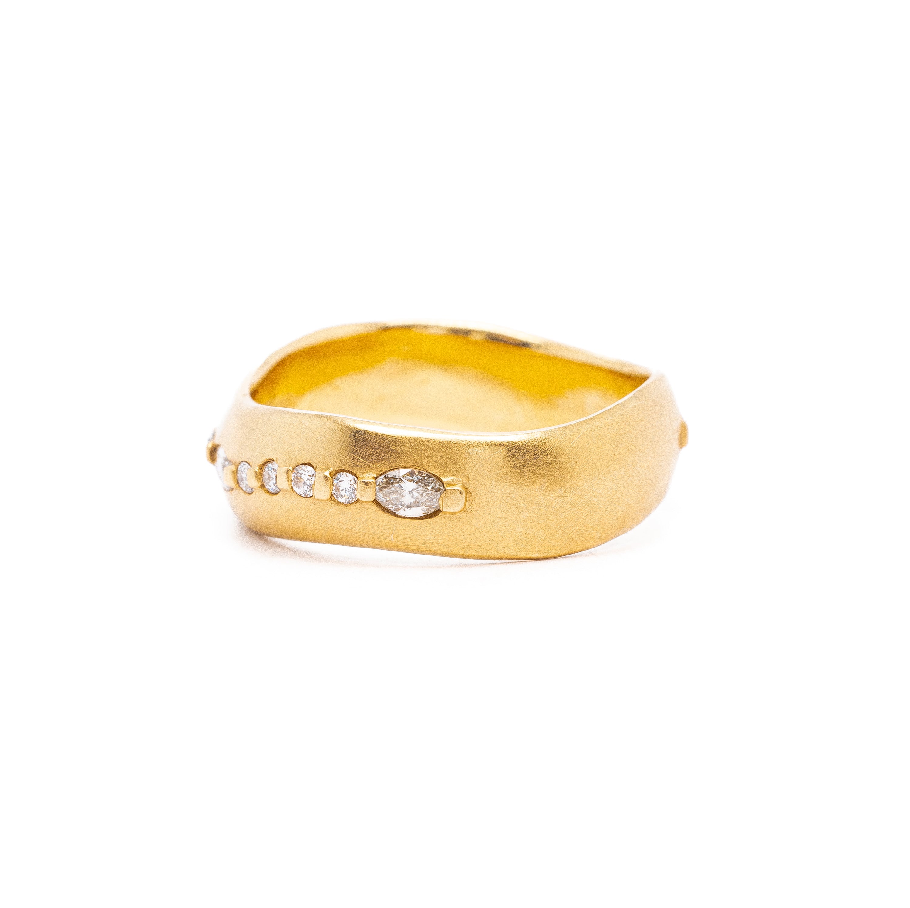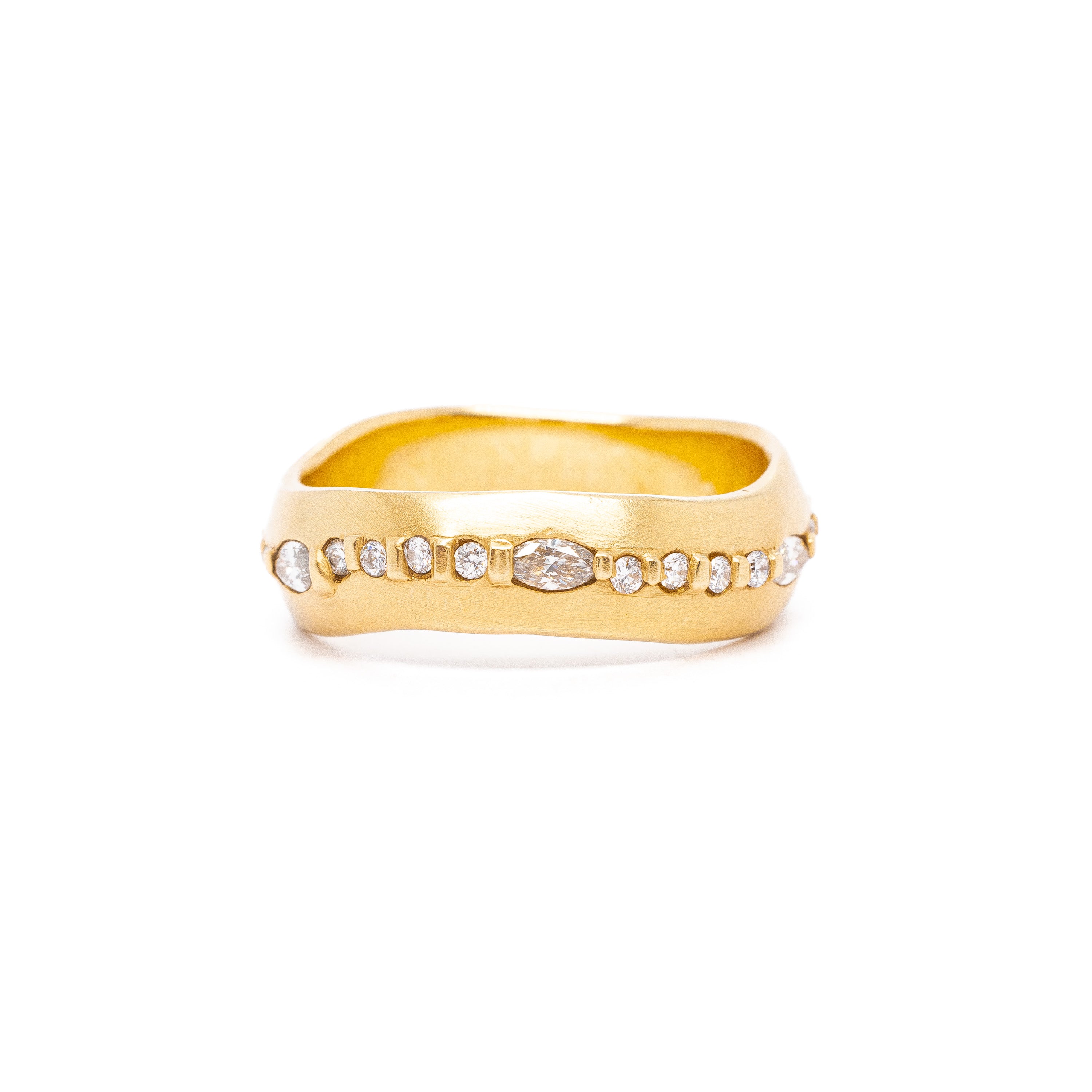 This ring is all about movement. The undulating gold band and the brilliant white diamonds glitter and dance around the finger.