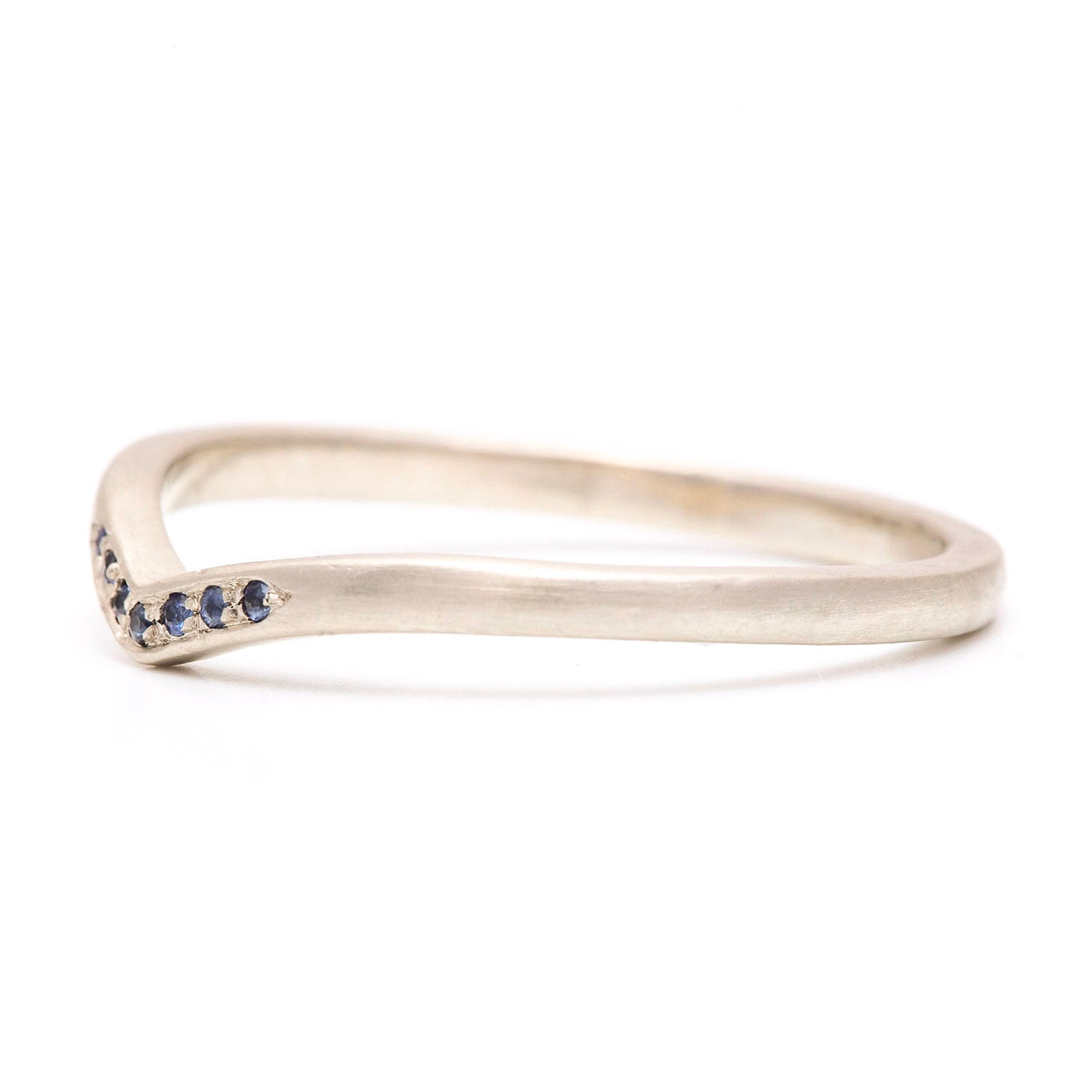 A dainty ring features a little sprinkling of little deep blue sapphires and a v-shaped contour that makes it perfect for nesting with other rings.