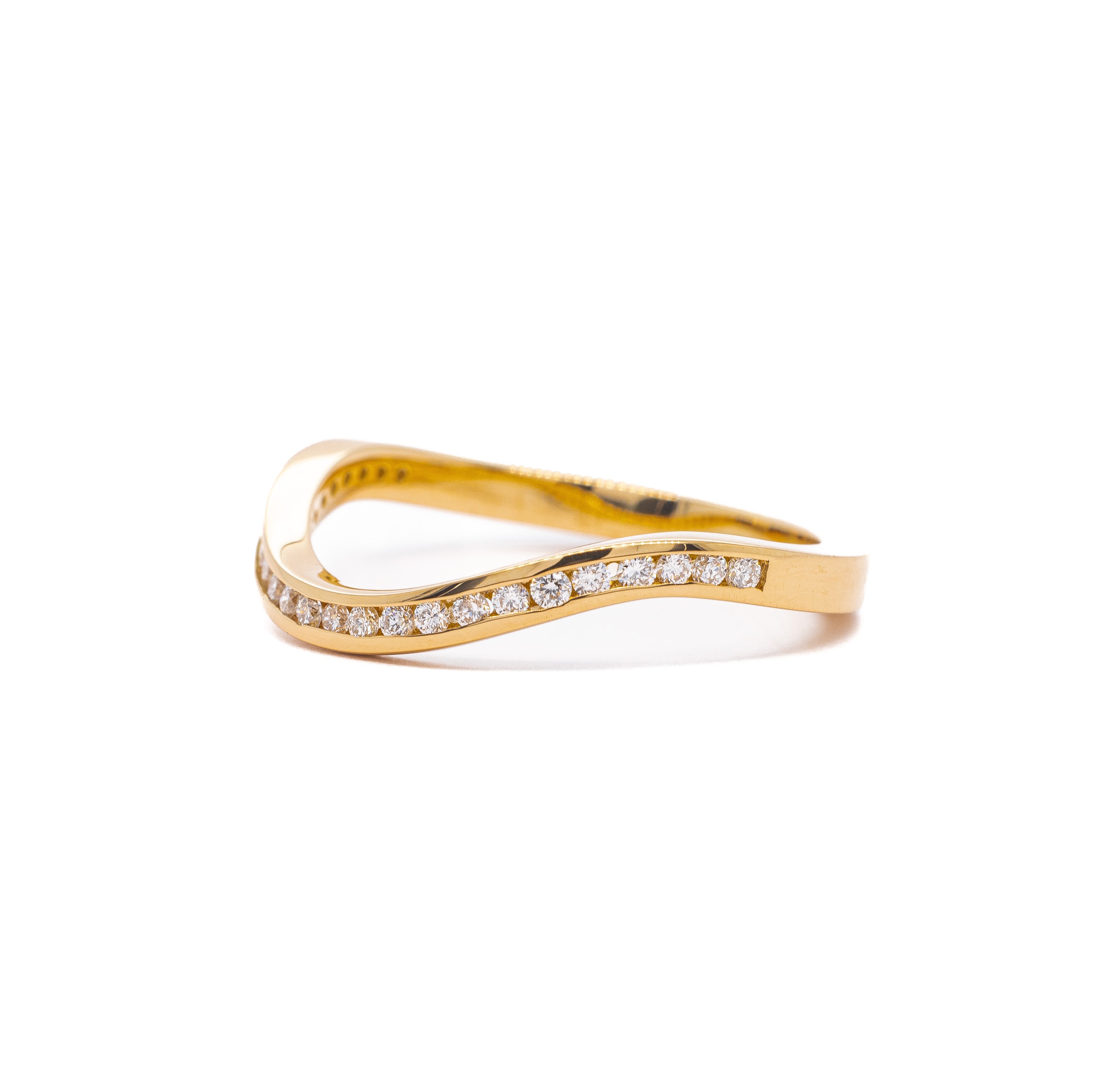 Sparkling round diamonds in a slim gold channel.