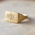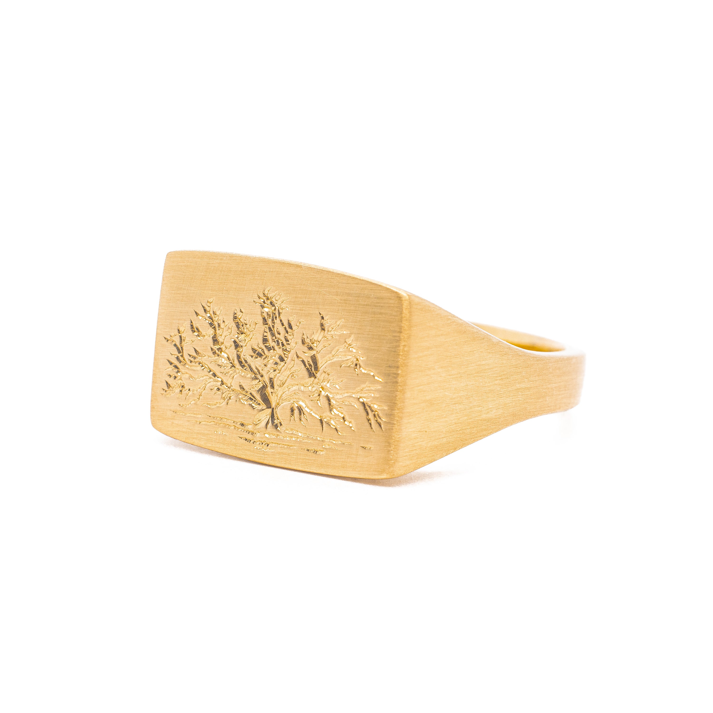A beautifully detailed locally hand engraved* California live oak sits on a wide rectangular signet ring.