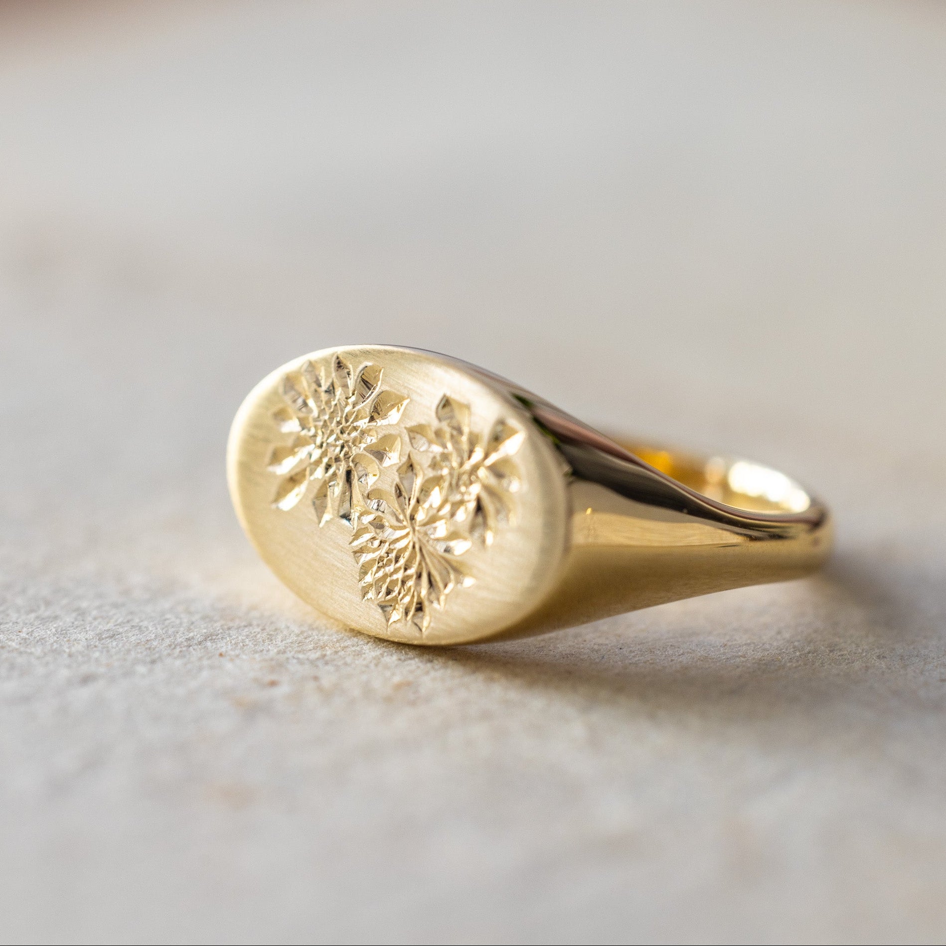A beautifully detailed locally hand engraved* native California dudleya succulent sits on a wide elongated oval signet ring.