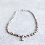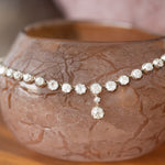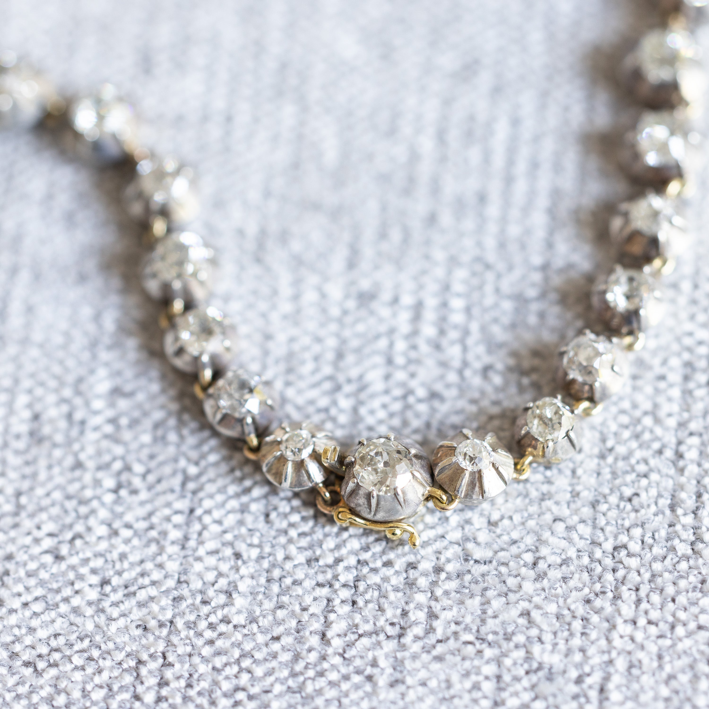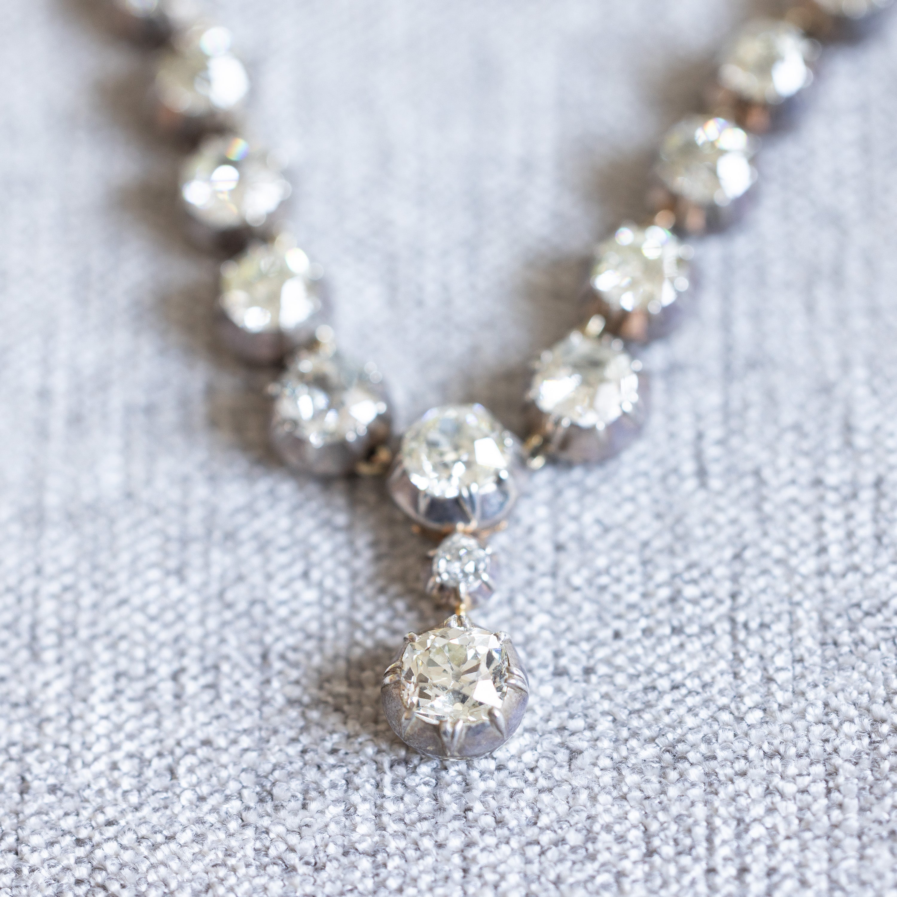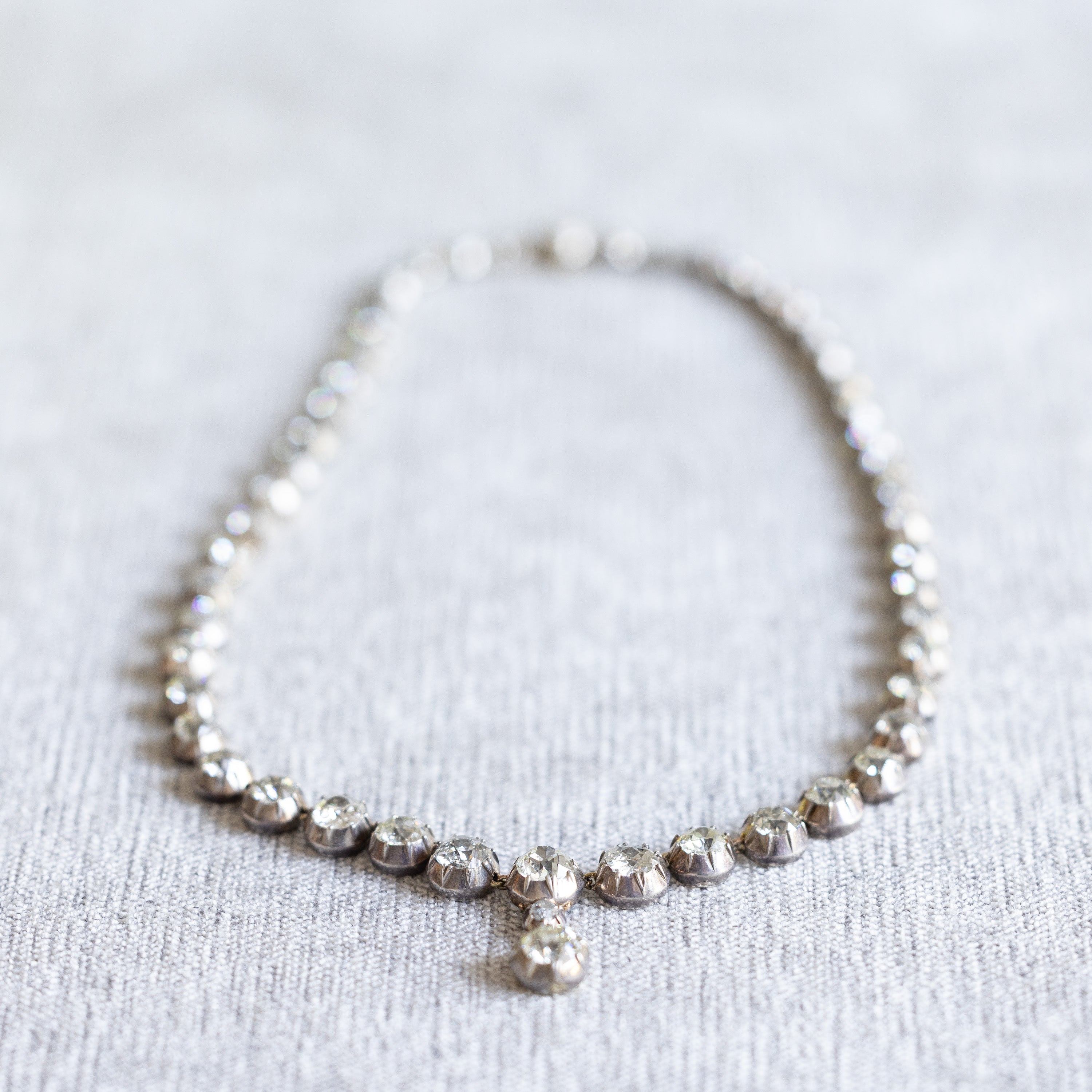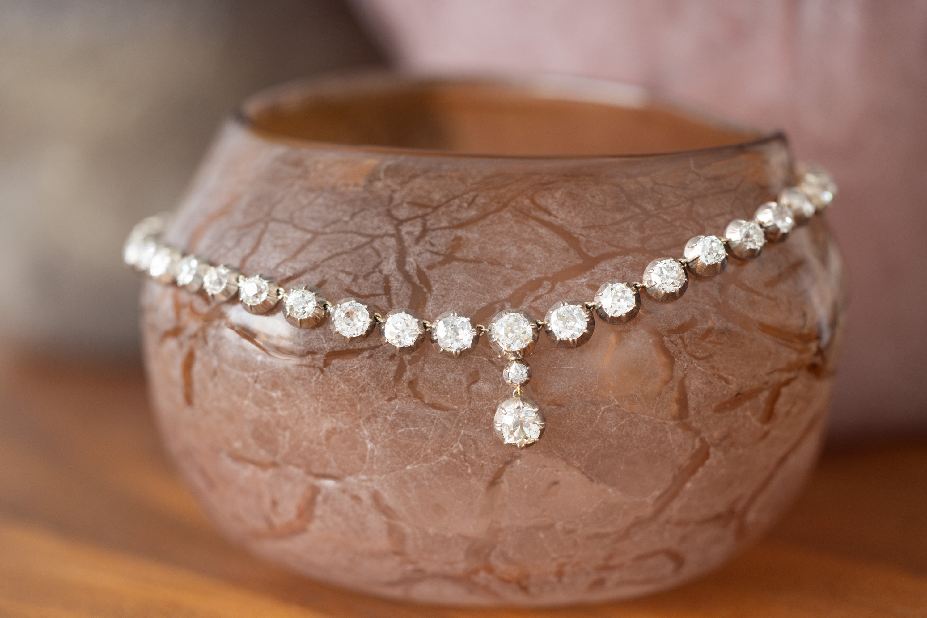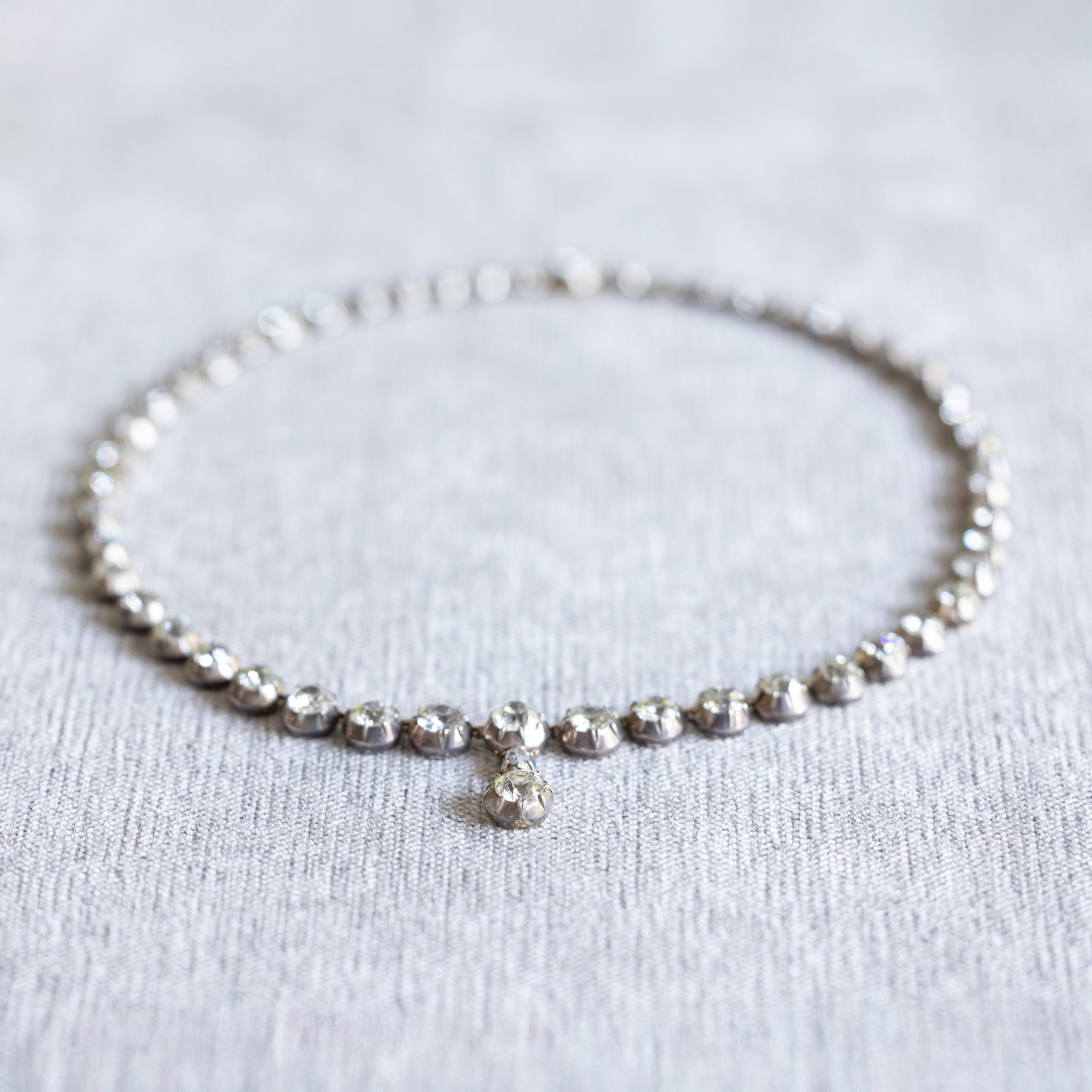 The name rivière refers to the French word for "river", the stones flow around the neck like a river of light. This lovely example has a charming diamond dangle.