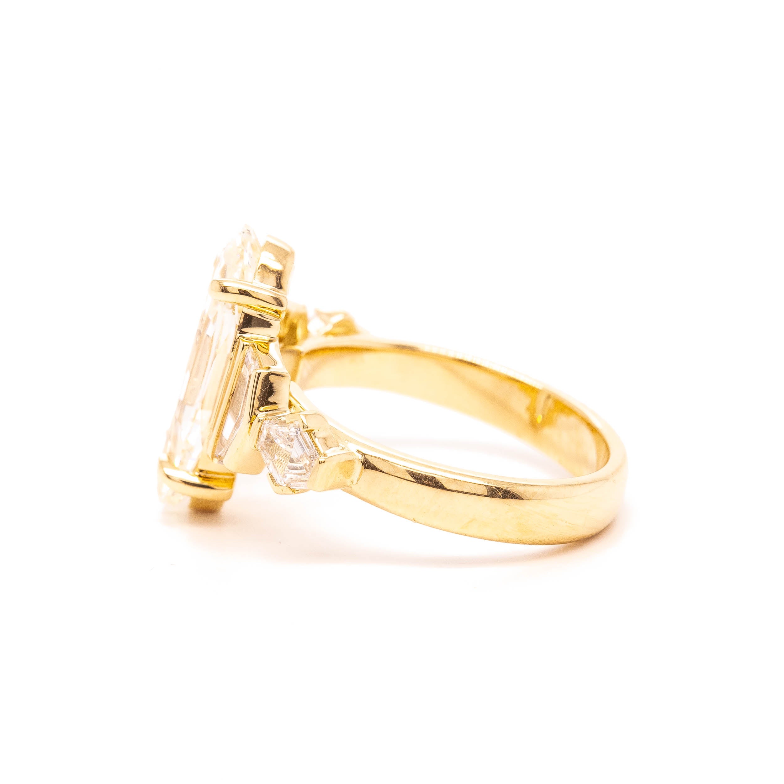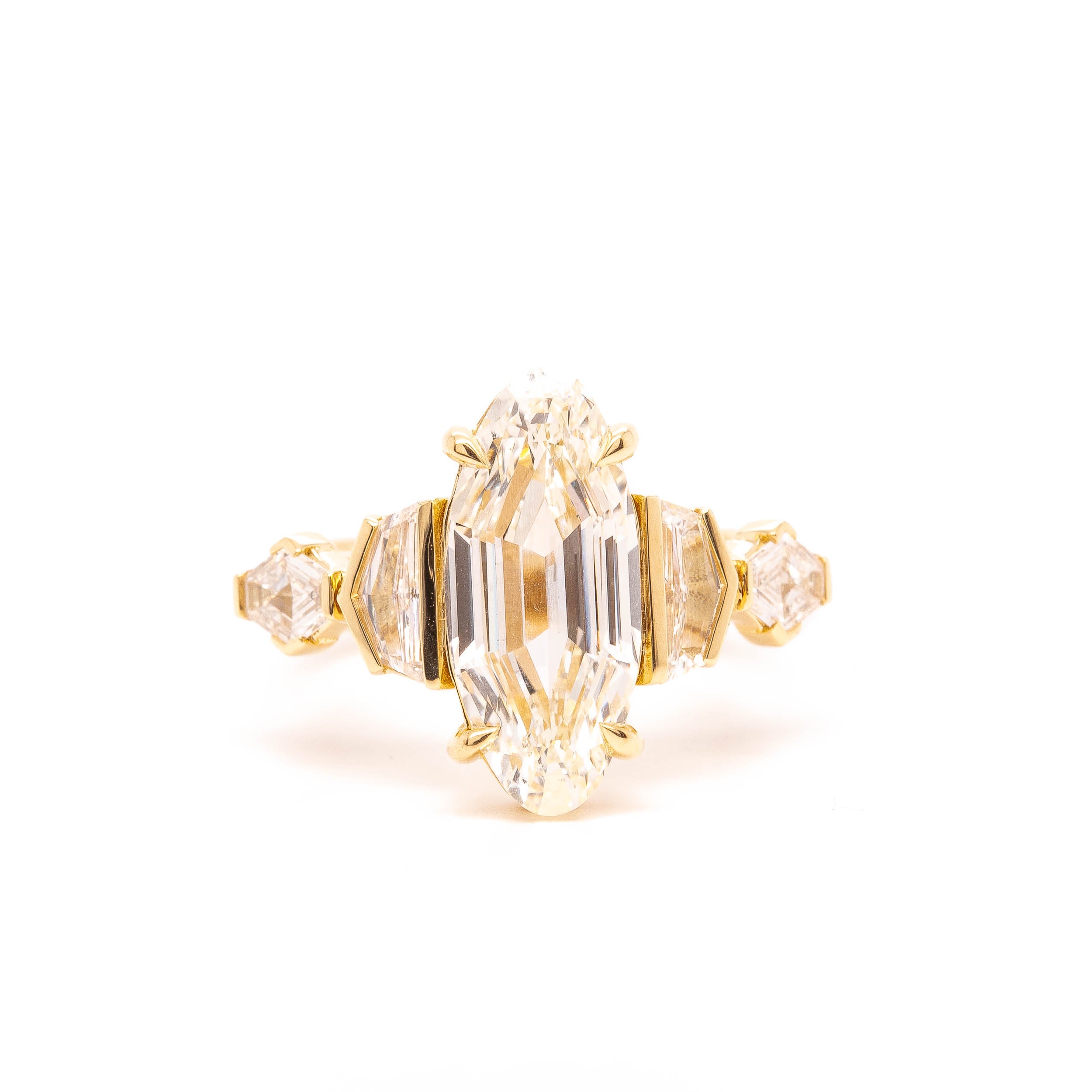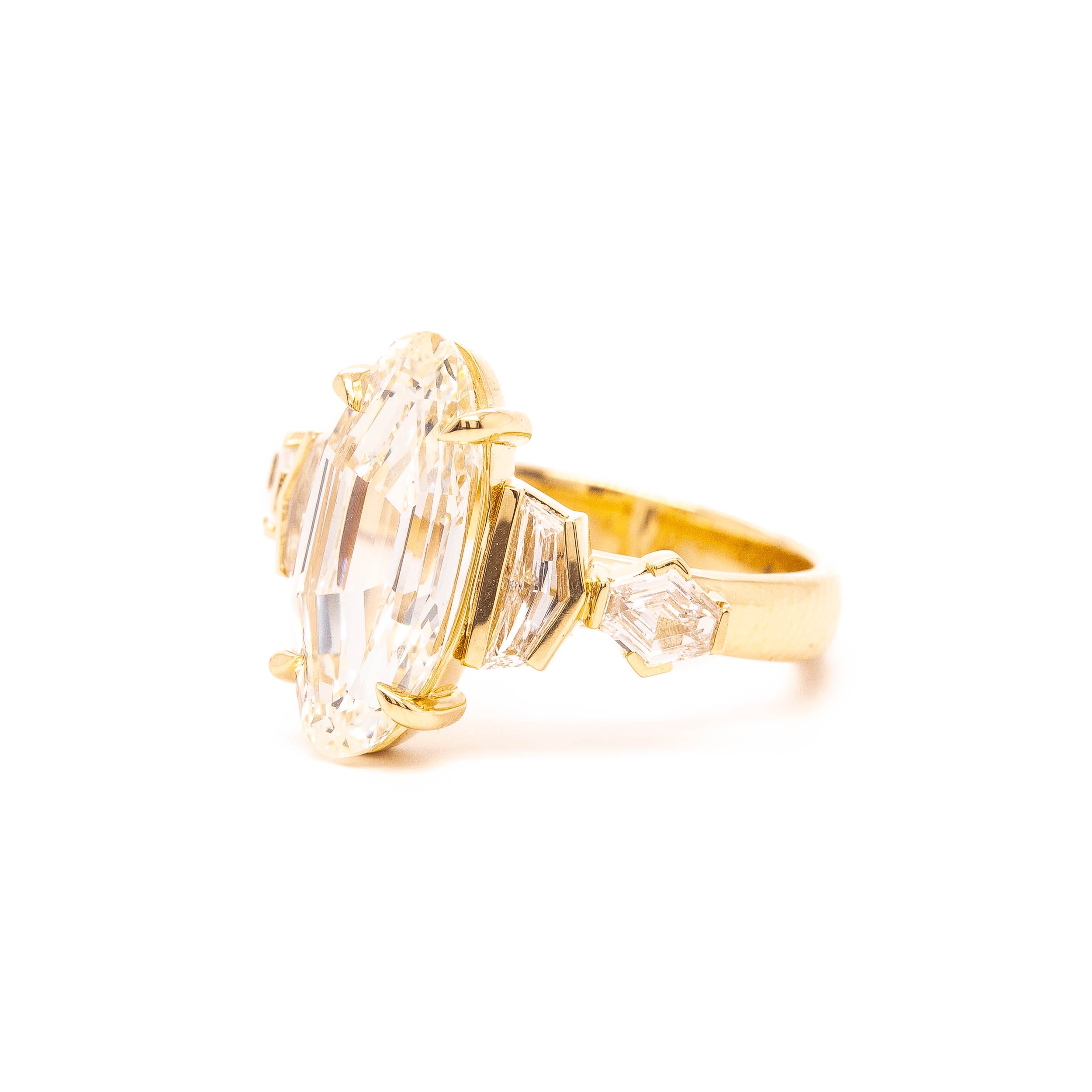 An absolute showstopper of a ring. The center step cut oval is ultra elongated at 16.23mm. Trapezoid and lozenge side diamonds flank the center stone for a bold geometric sparkle.