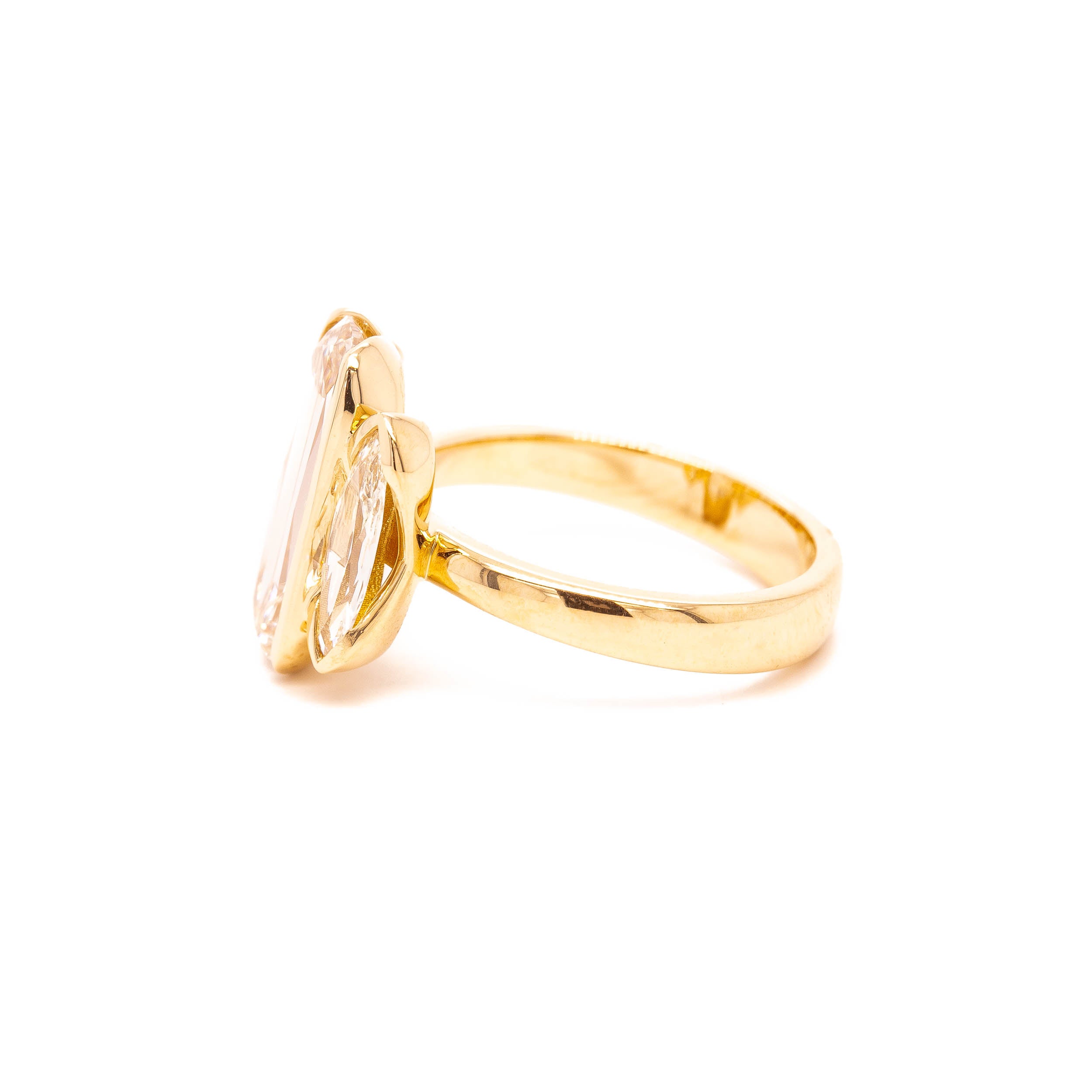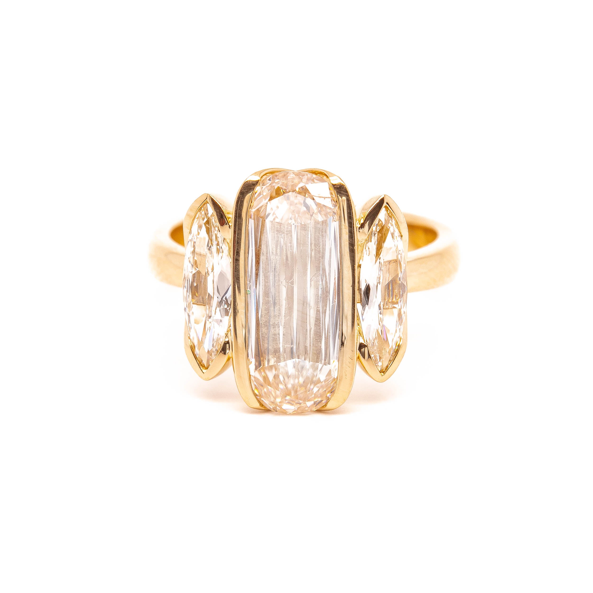 This ring redefines unique. With an impossibly long half bezel set cushion diamond set low to the finger next to equally long moval diamond side stones.