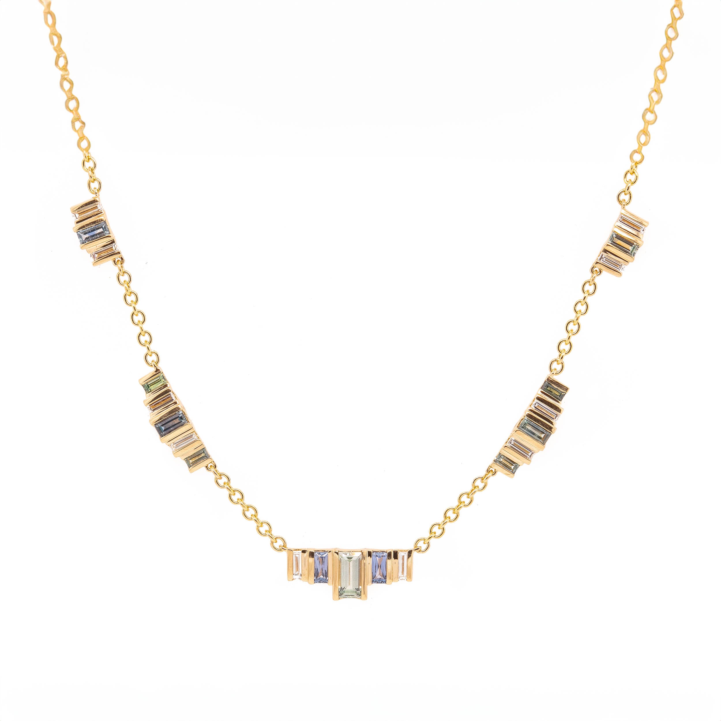 A stunning collar necklace with mixed color blue and green Montana sapphires and baguette diamond accents, The five stations of sapphires are dramatic and elegant.