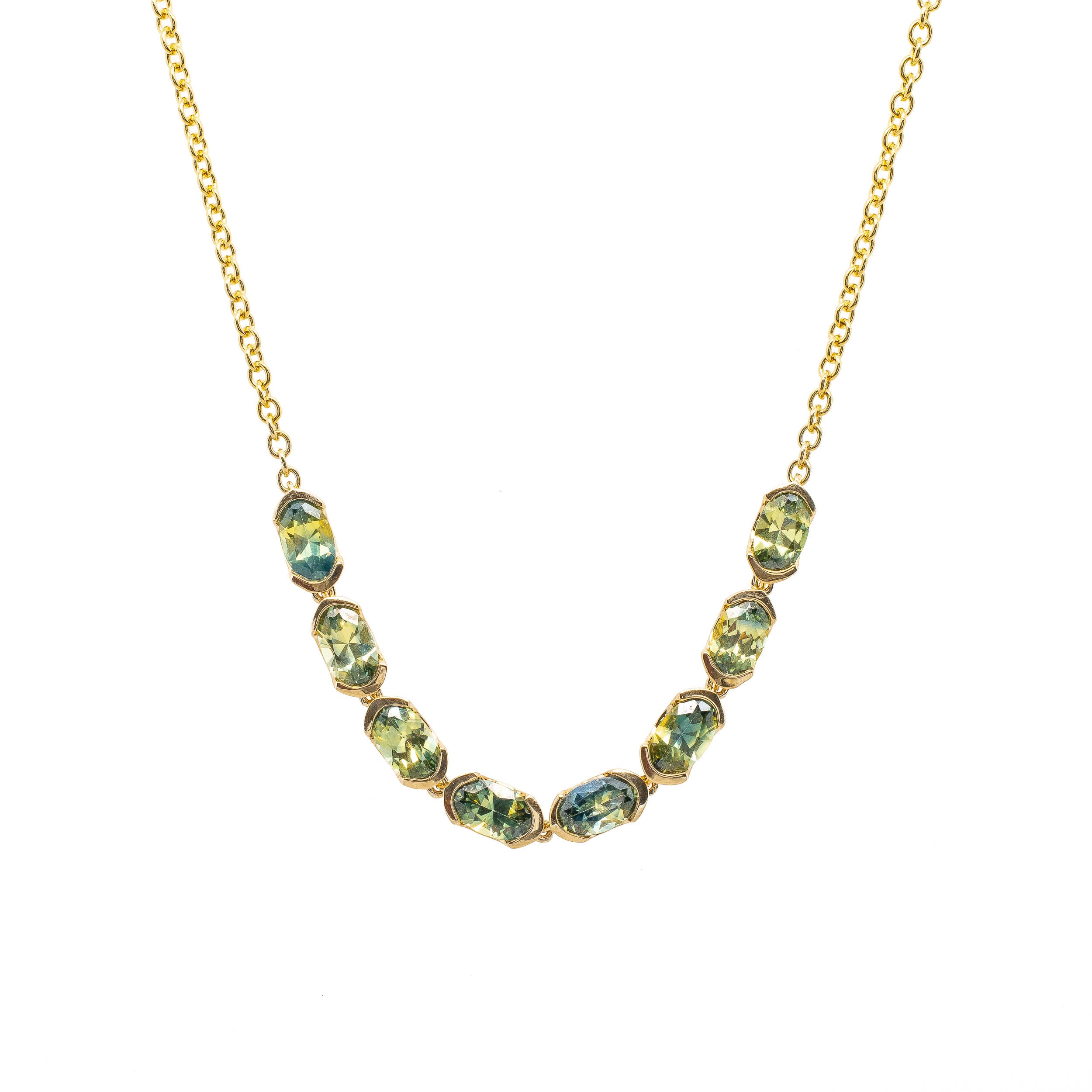 A veritable garden of color, these oval Australian sapphires are set in-line in a one-of-one half bezel necklace. The stones are linked together to move freely and capture the teal and bright yellow green sparkle.