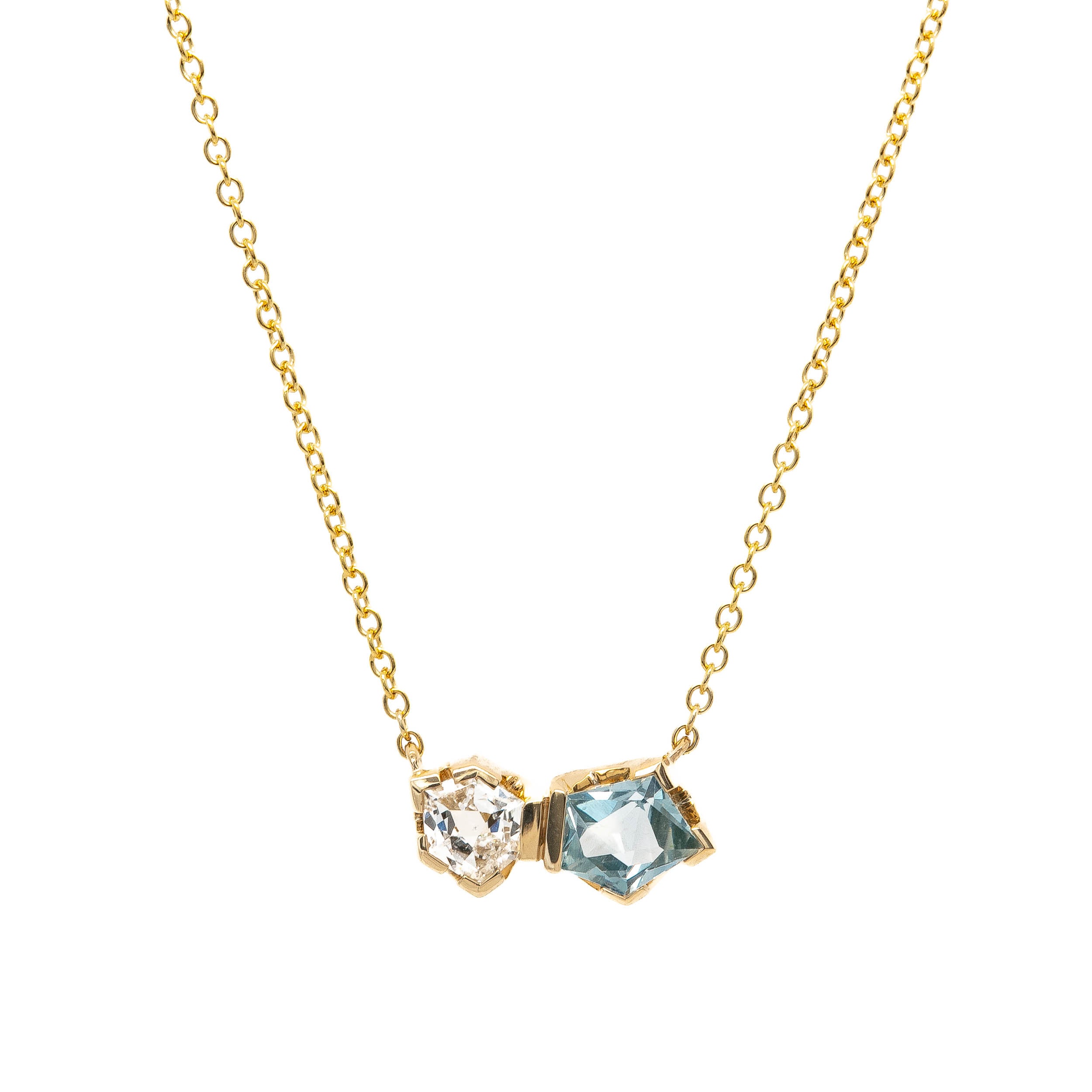 The perfect odd pairing, a pleasingly abstract diamond and a icy blue geometric Montana sapphire are set in-line for an interesting daily piece.