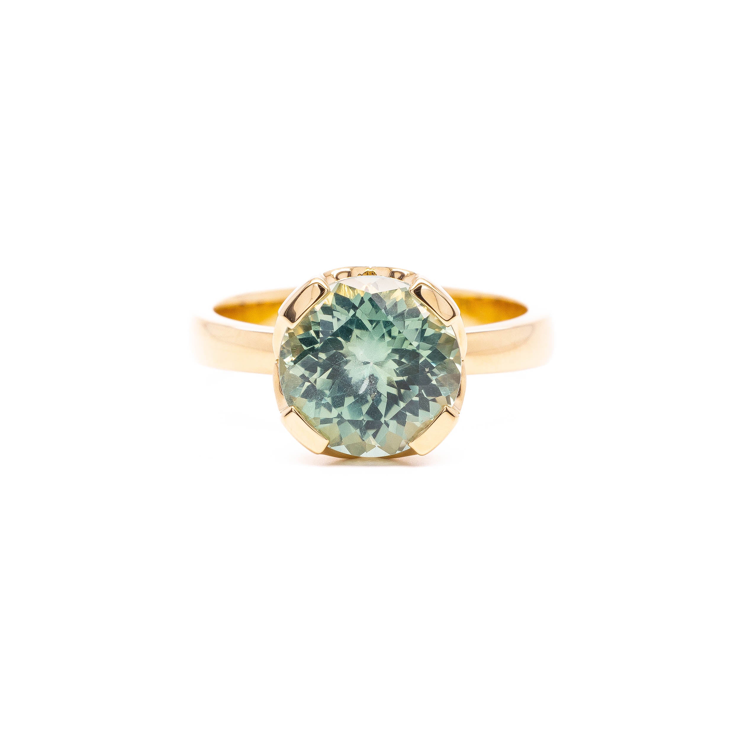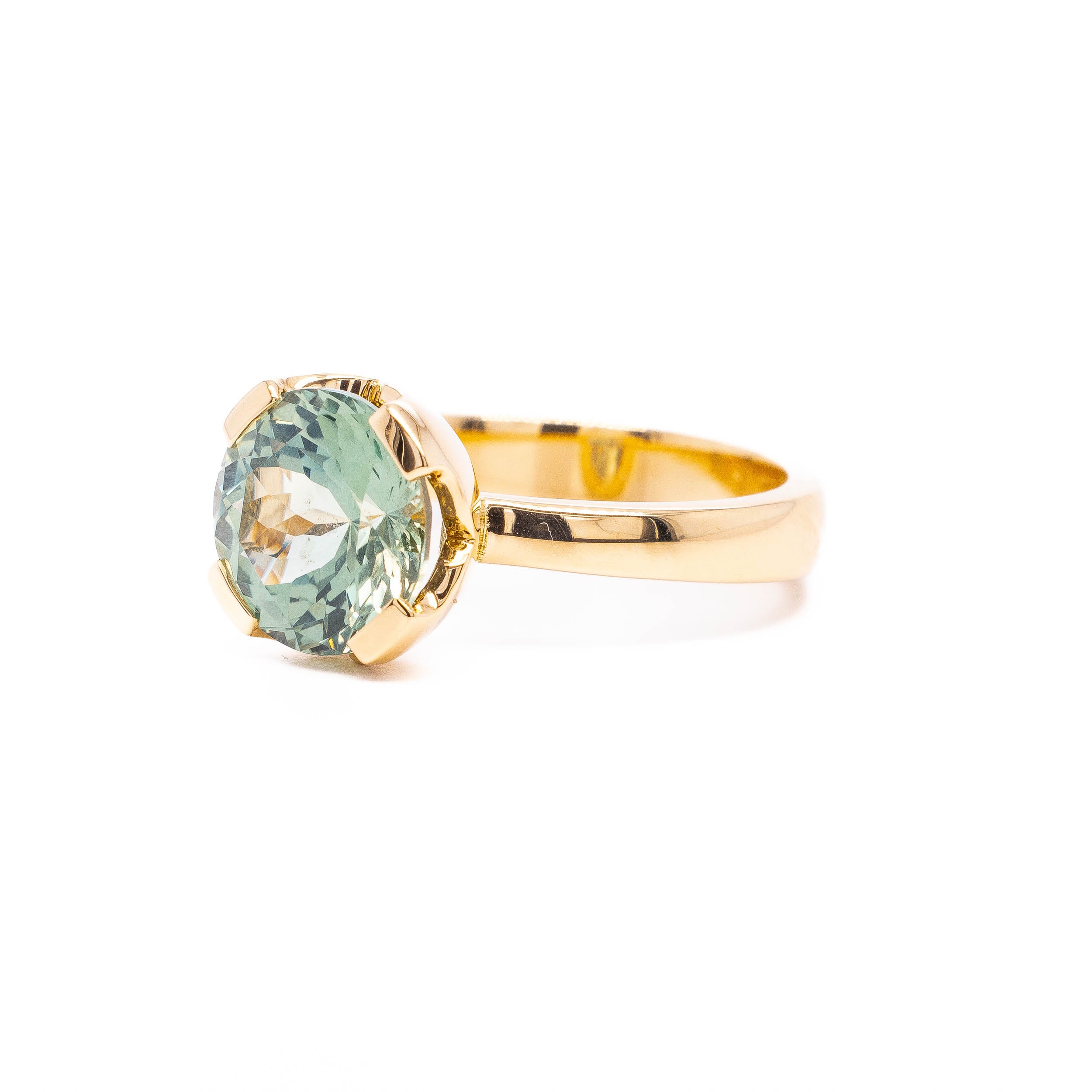 Simple tab prongs hold this 3.75ct minty green Montana sapphire. Arabesque cutouts expose the stones side view and the large scale sapphire sits low and stacking in glowing 18k gold.