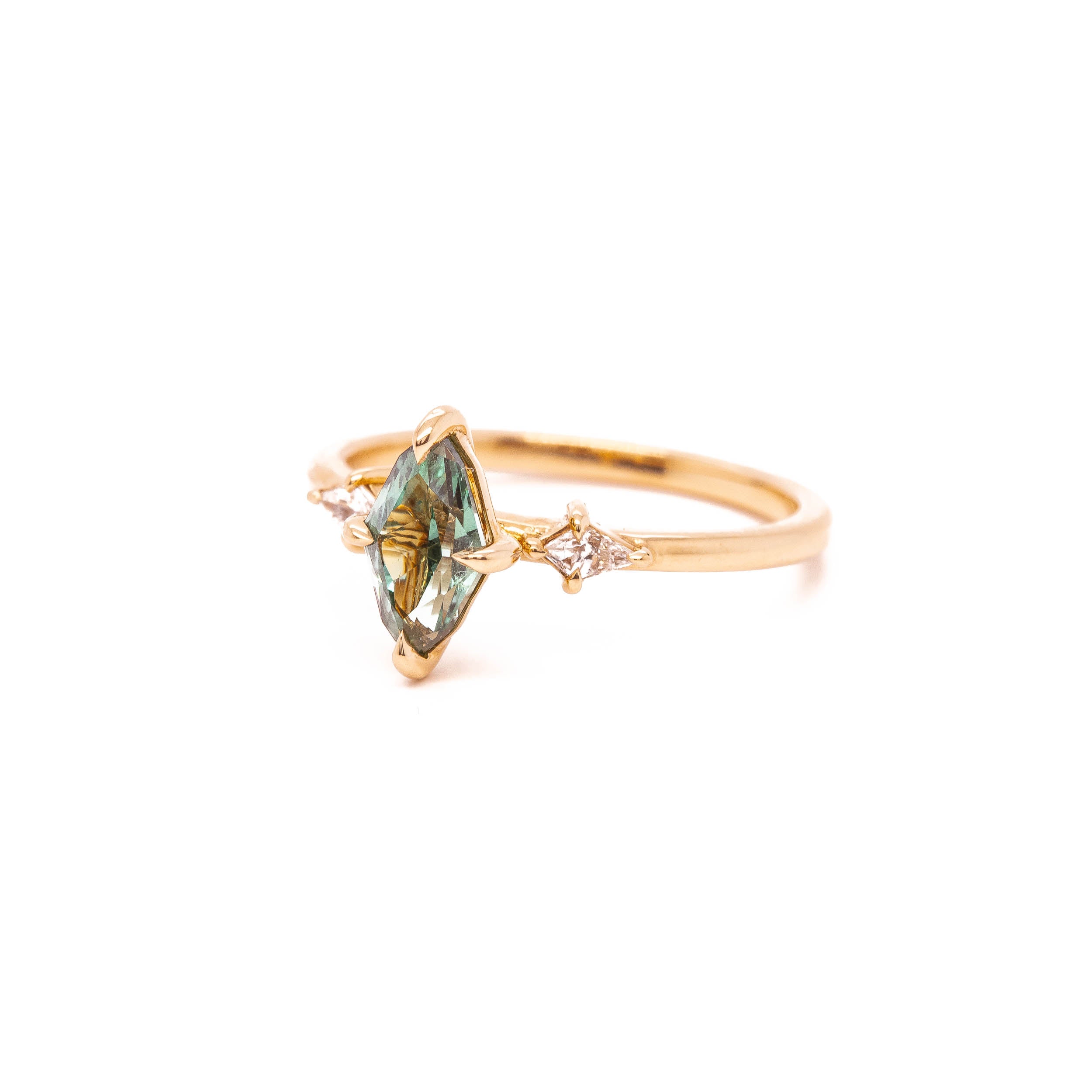 A dainty lozenge green sapphire is compass set next to the sweetest kite shaped diamonds.