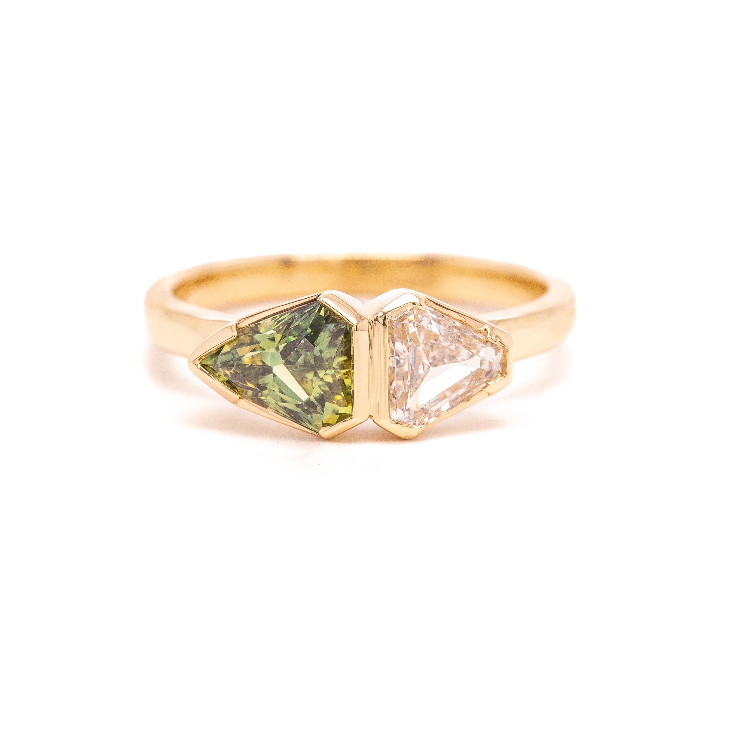 A lush green Australian shield sapphire sits harmoniously with a sparkling shield diamond.