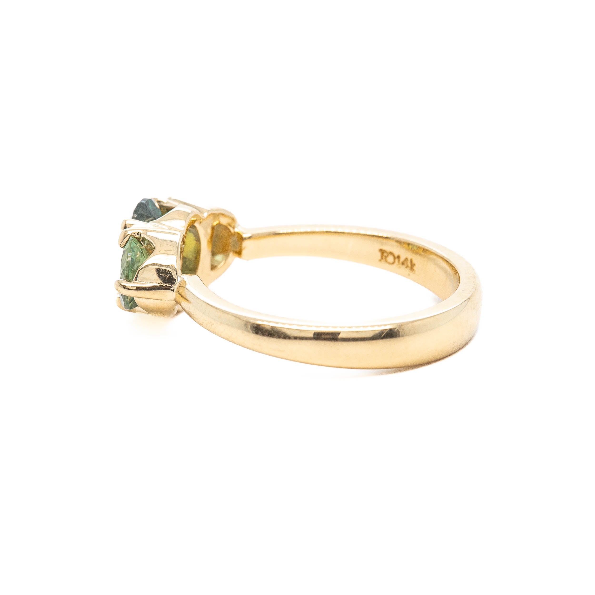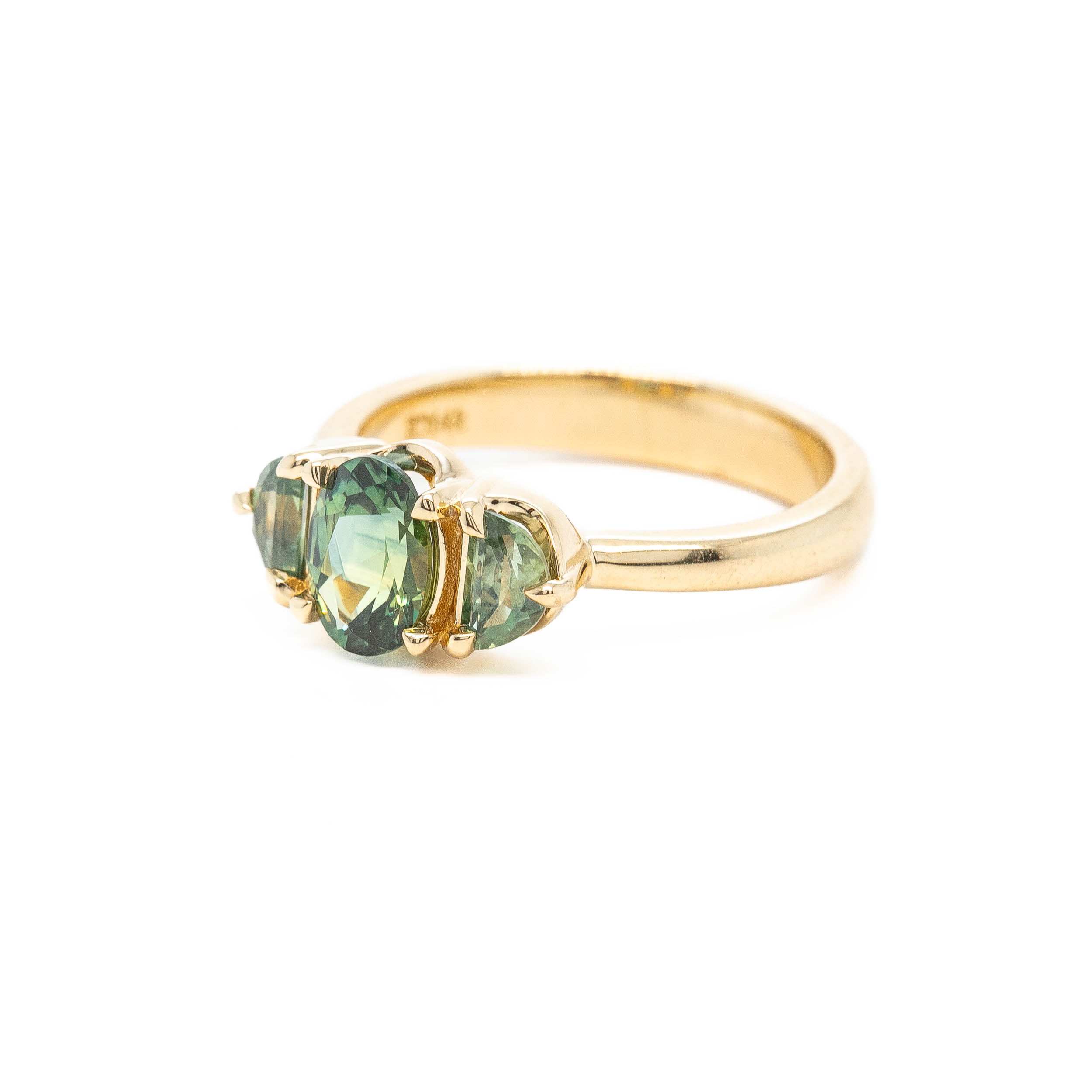 A beautifully tonal teal sapphire center stone is nestled between sea foam half moon Montana sapphires. We named it after the Lady of the Lake or Nimue in Welsh.