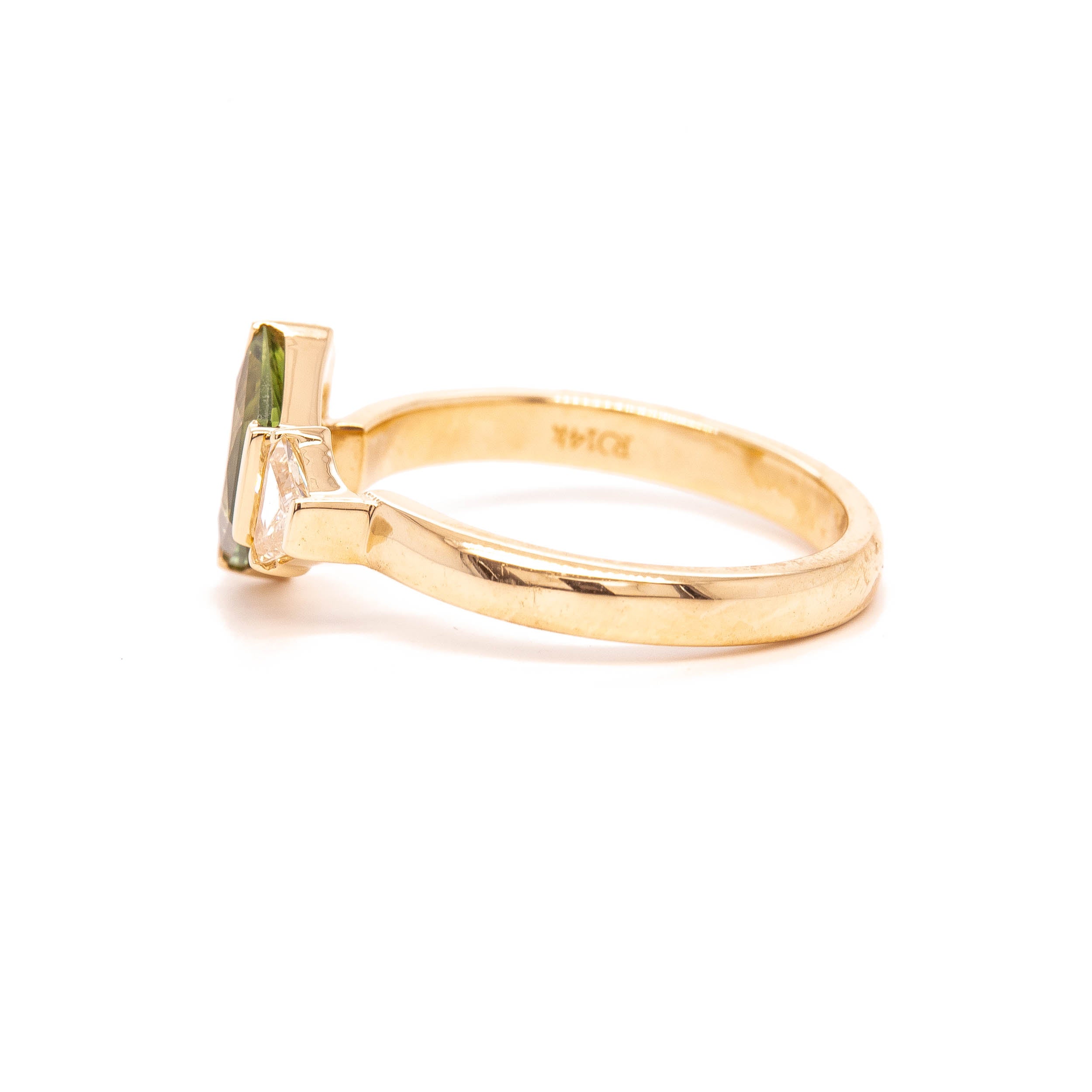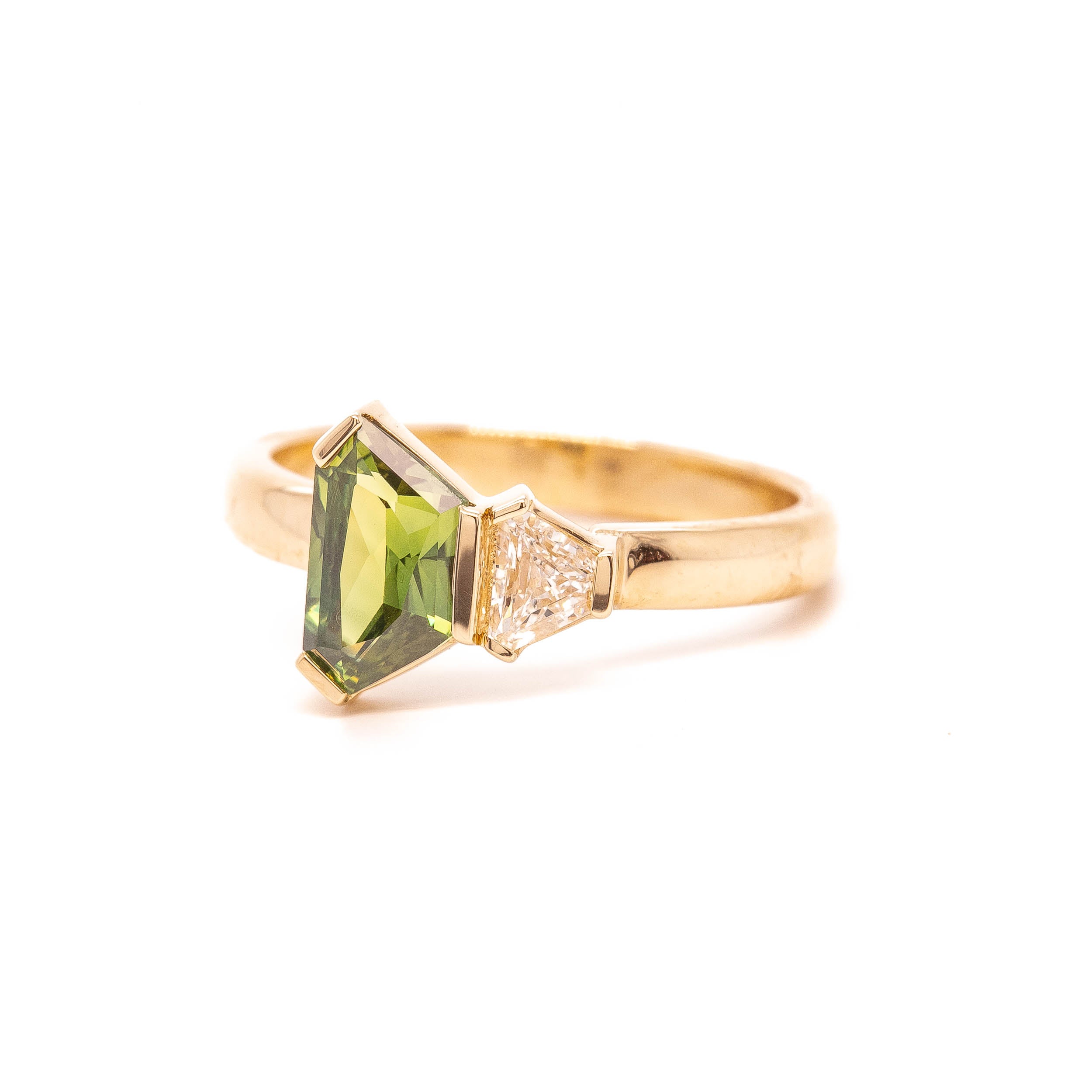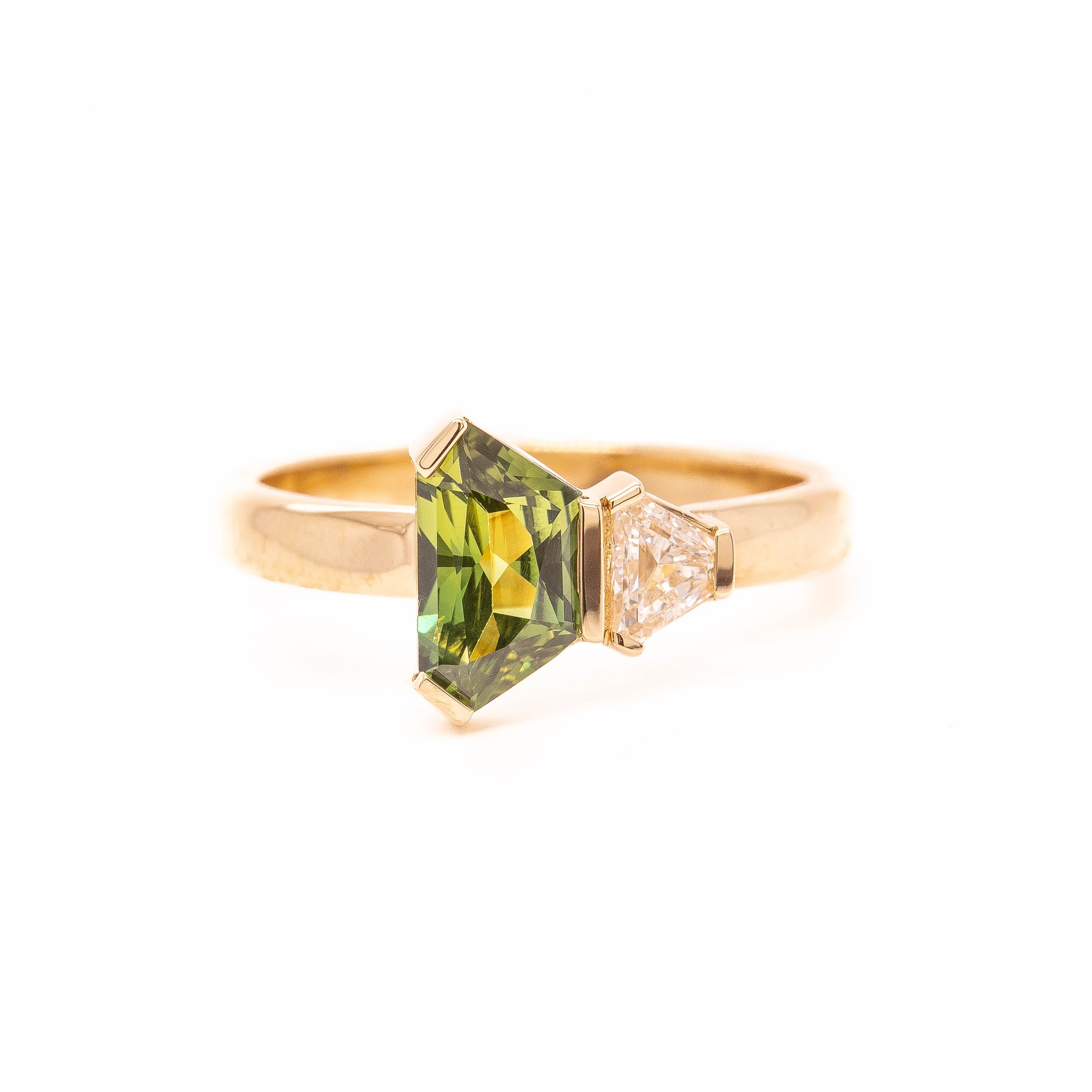 We love a two stone ring where the diamond and sapphire details are so in sync.  A sweetly sparkling shield diamond leads a funky Australian sapphire in this alternative engagement ring.