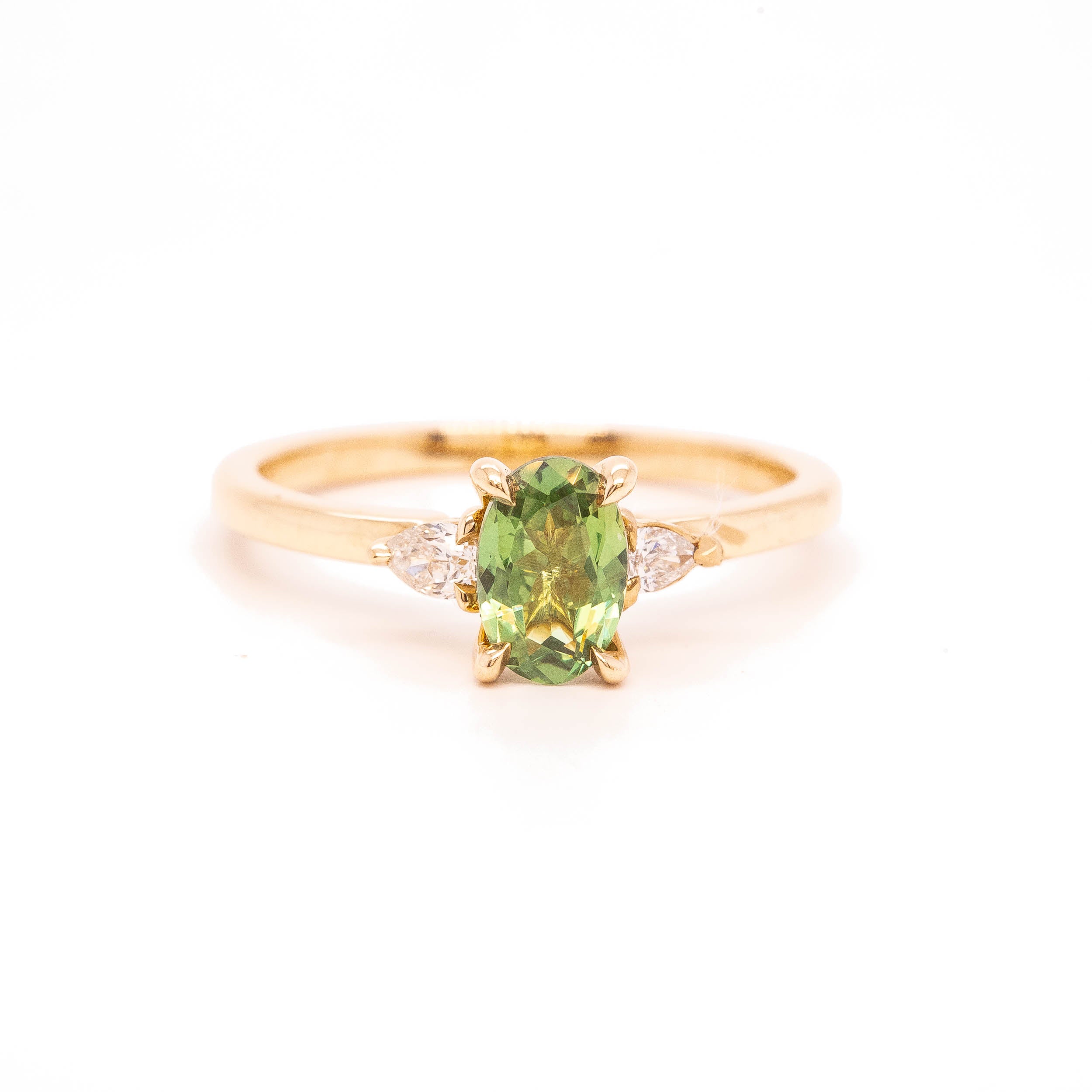 A sweet three stone ring, a cheerful green sapphire is paired with dainty pear diamonds for an accompanying sparkle.