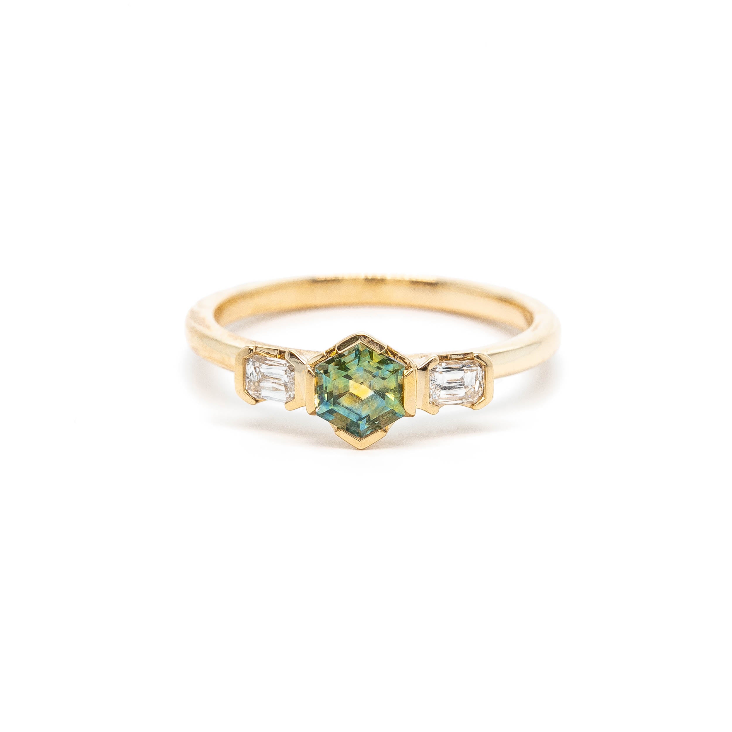 The prettiest kaleidoscope hexagon Montana sapphire is set in tab prongs that highlight the shapes with petite emerald cut diamonds on either side.