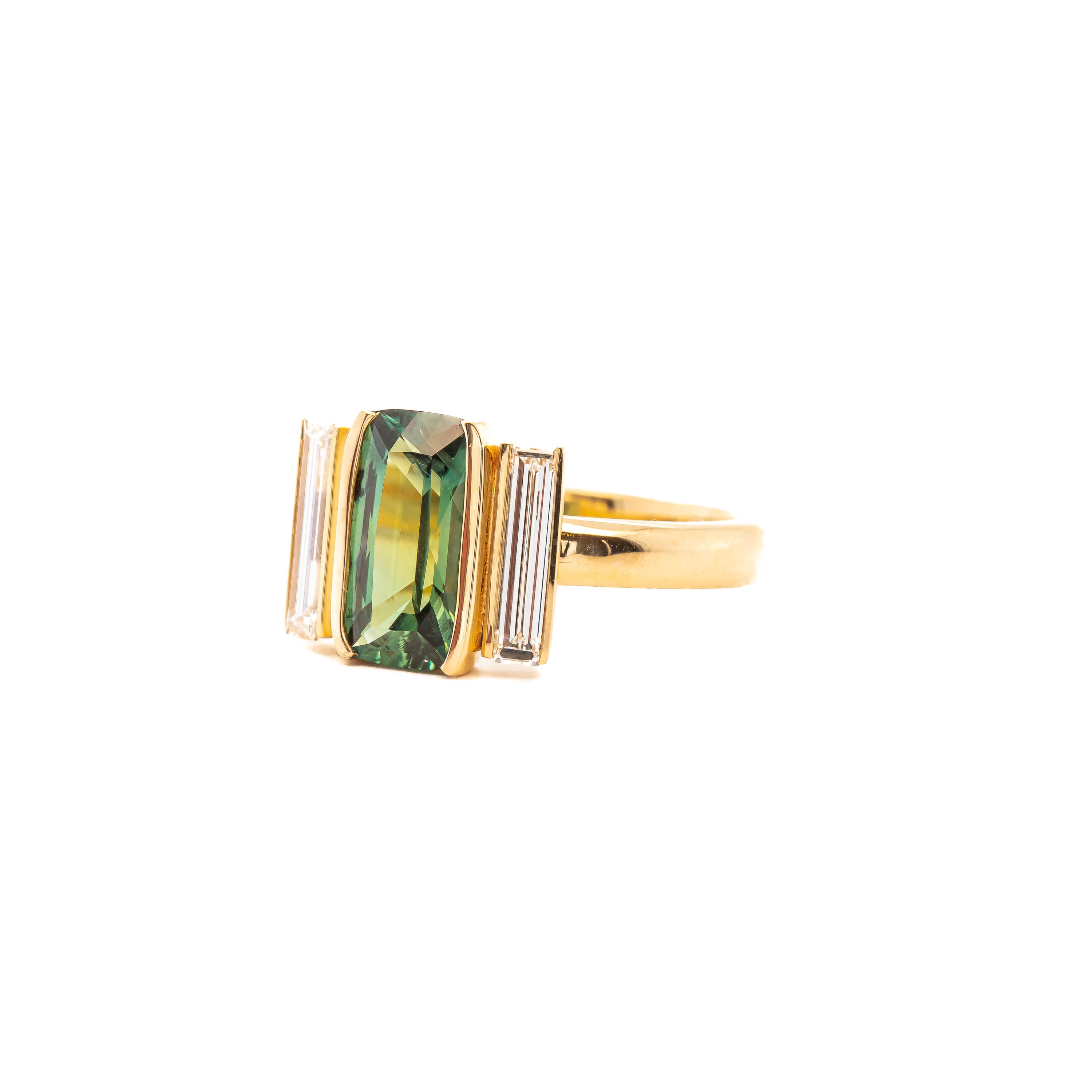 This is the three stone engagement ring in its final form. We have lovely elongated sapphires and diamonds, the lowest profile possible while remaining stackable, and the slimmest half bezels holding the stones in place. Both modern and retro this ring is in it's own league.