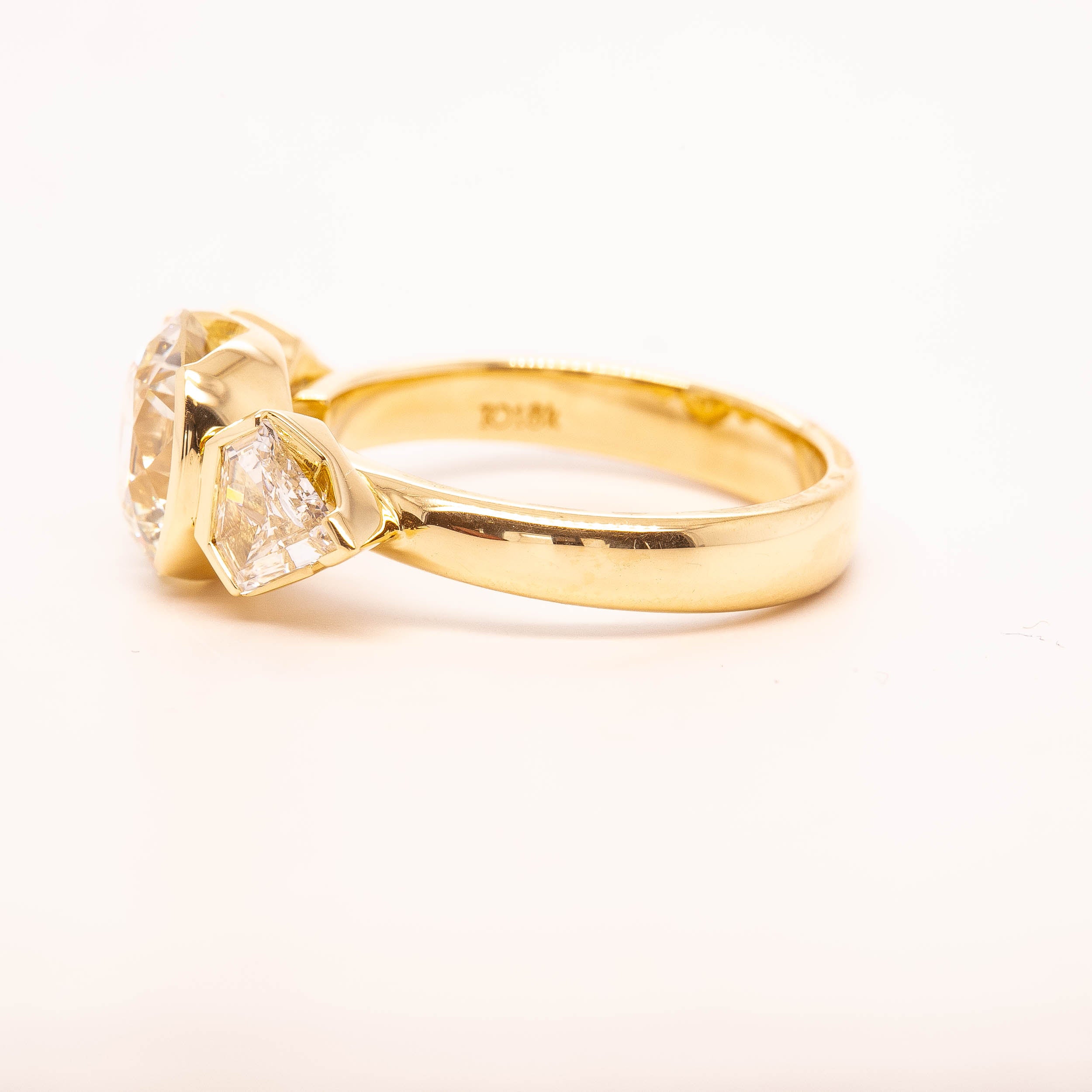 Everything about this beauty is generous. The 3ct old euro center stone and the bold step cut shield diamond side stones. The glowing 18k yellow gold, slim half bezels and finally the lovely wide tapered half round band.