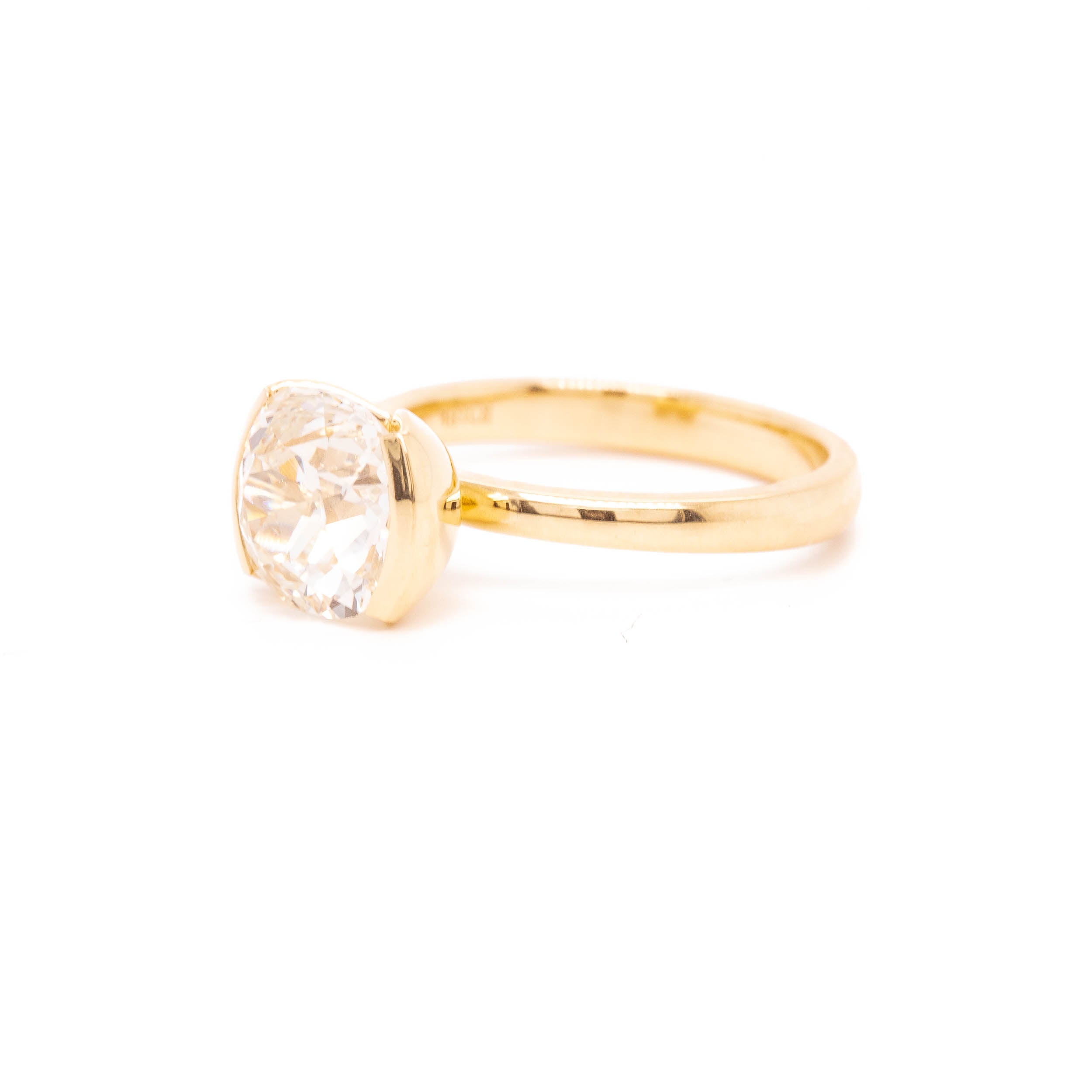 This beautiful old mine is all cushiony gorgeousness. We kept it simple with and 18k east west half bezel that leads down to a smooth tapered band.