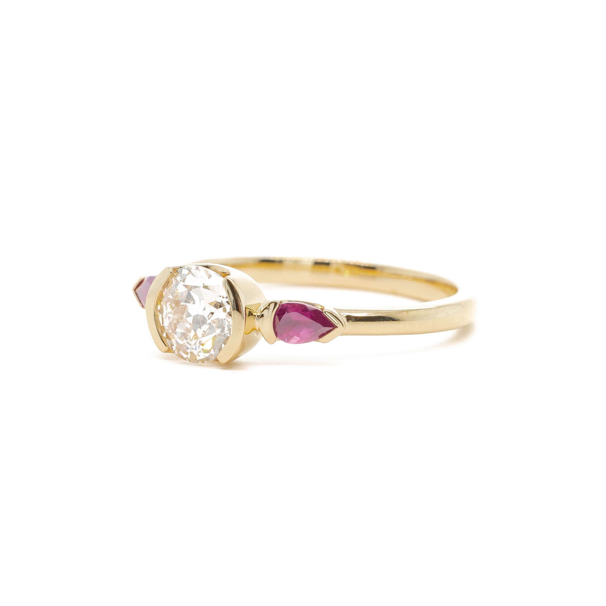 A sweetly sparkling antique diamond is accented by deep red ruby cape-like side stones for the a ladylike three stone ring.