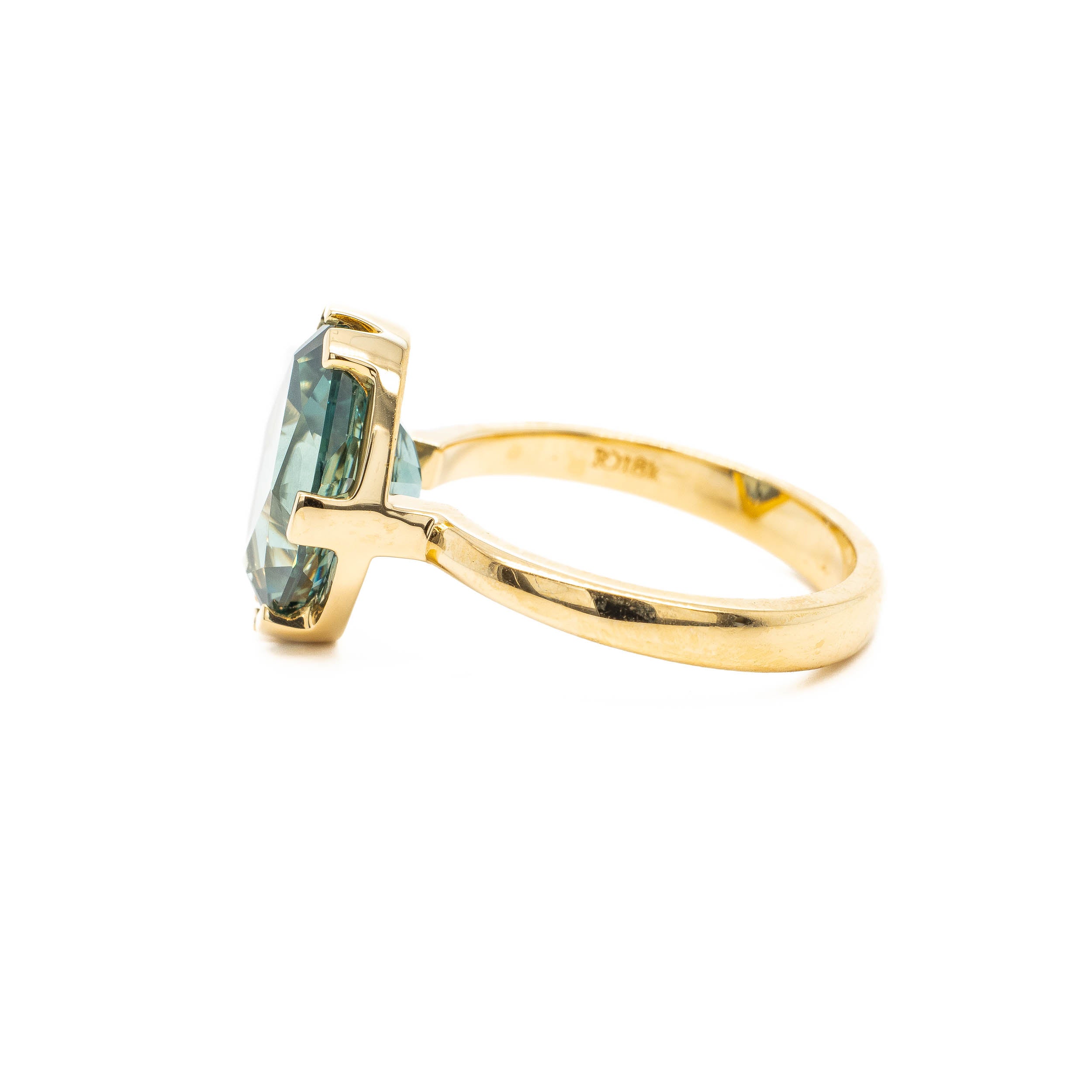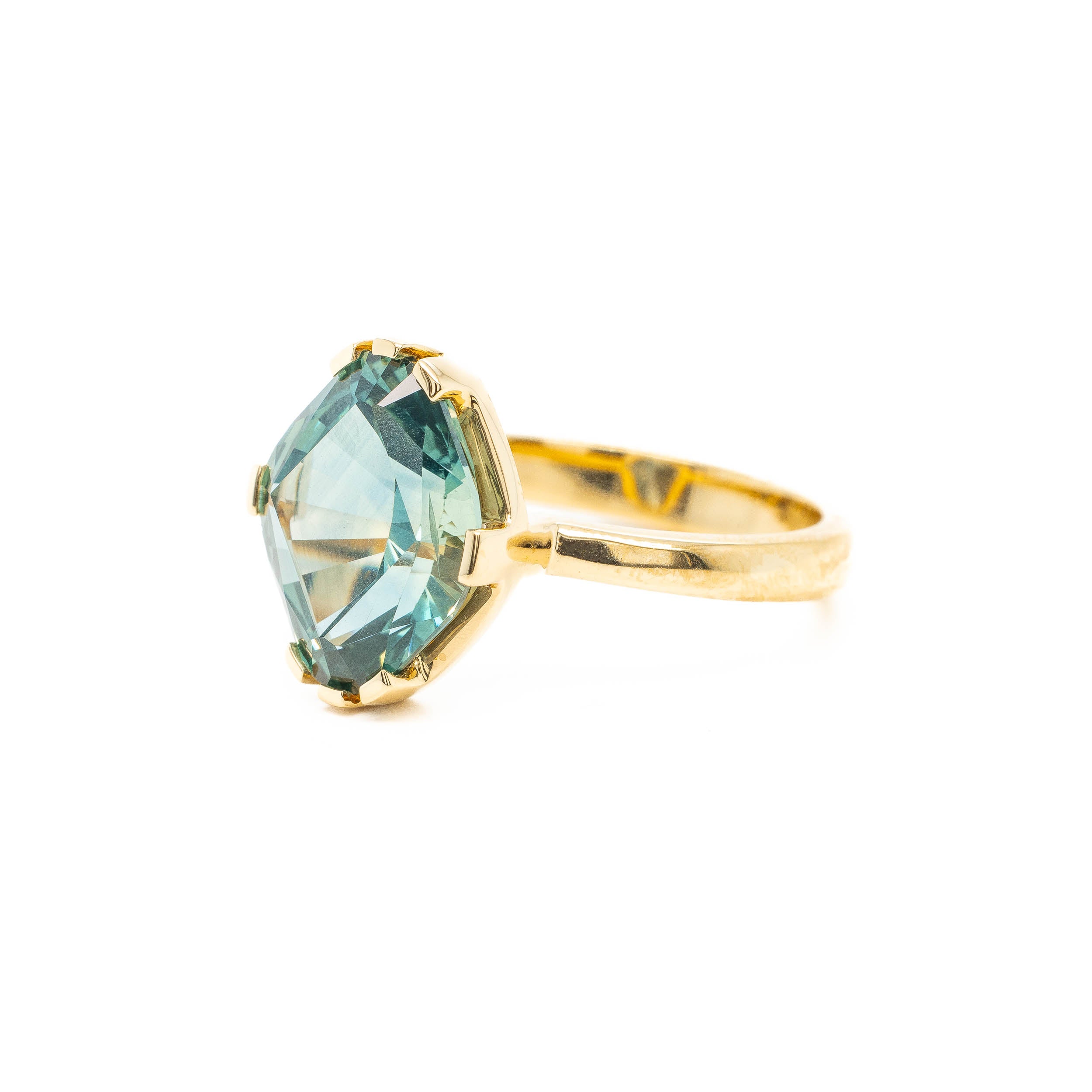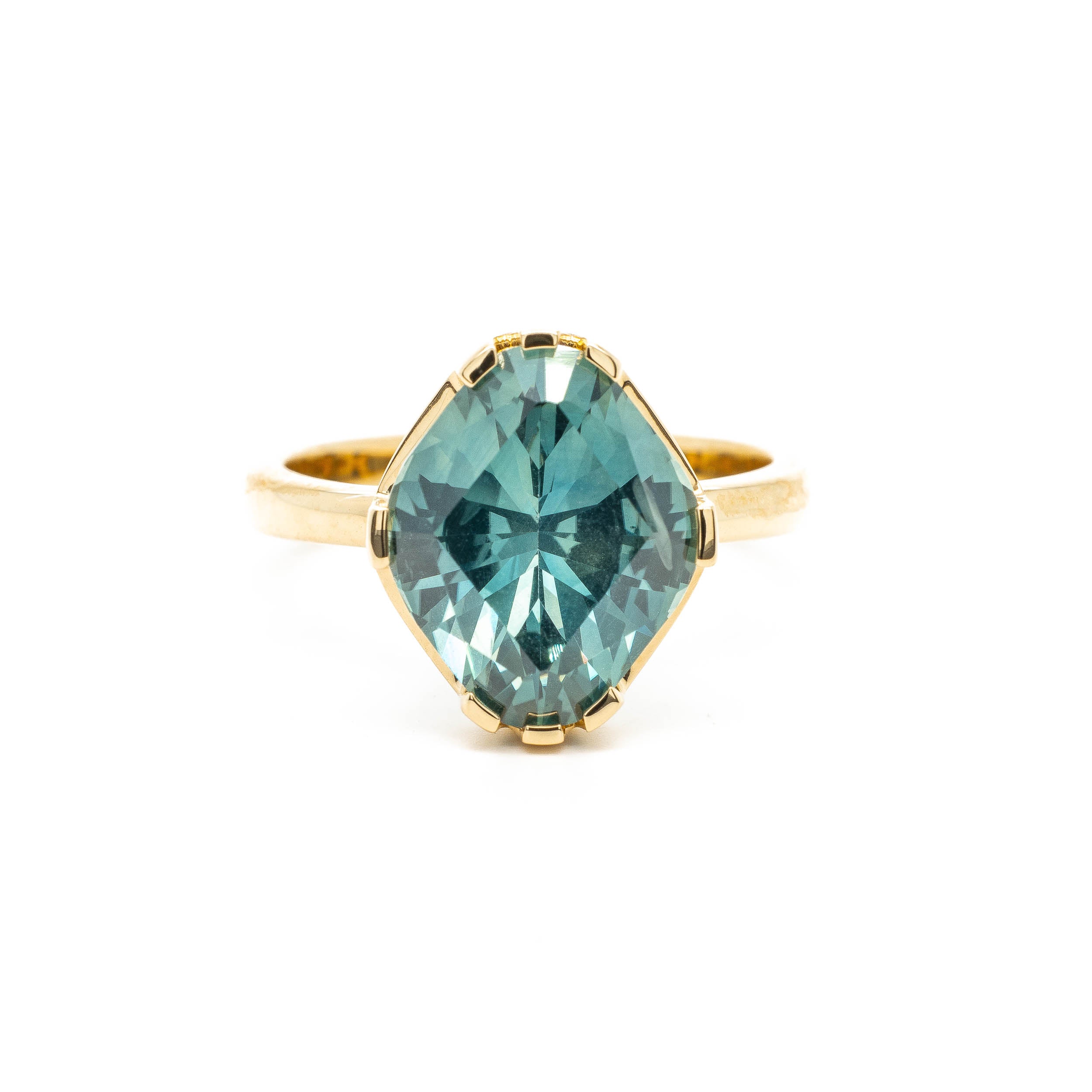 One of the most incredible Montana sapphires we have ever seen, a 5.79ct lozenge with soft edges and a deep teal color. Set in 18y yellow gold and unique crenellated tab prongs.