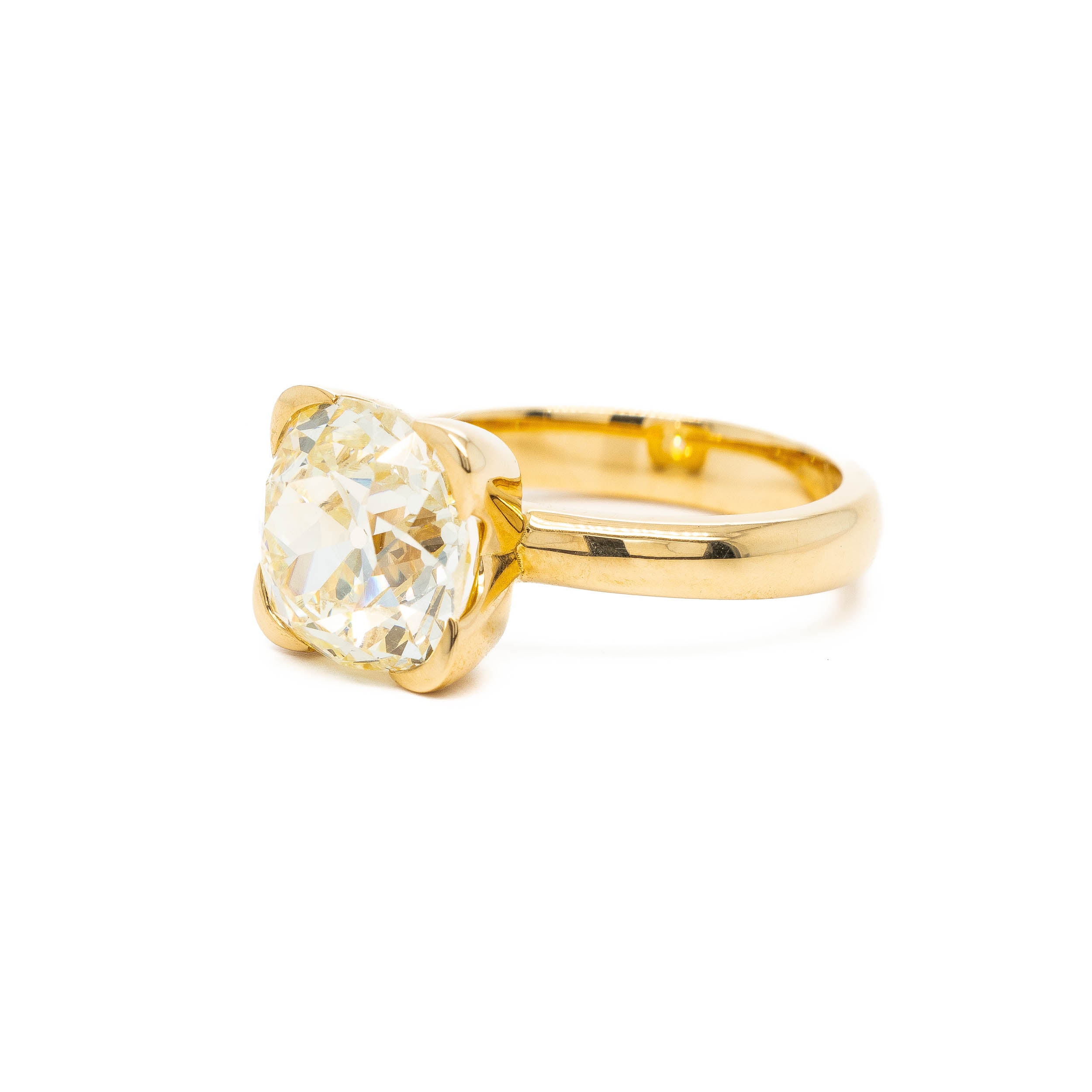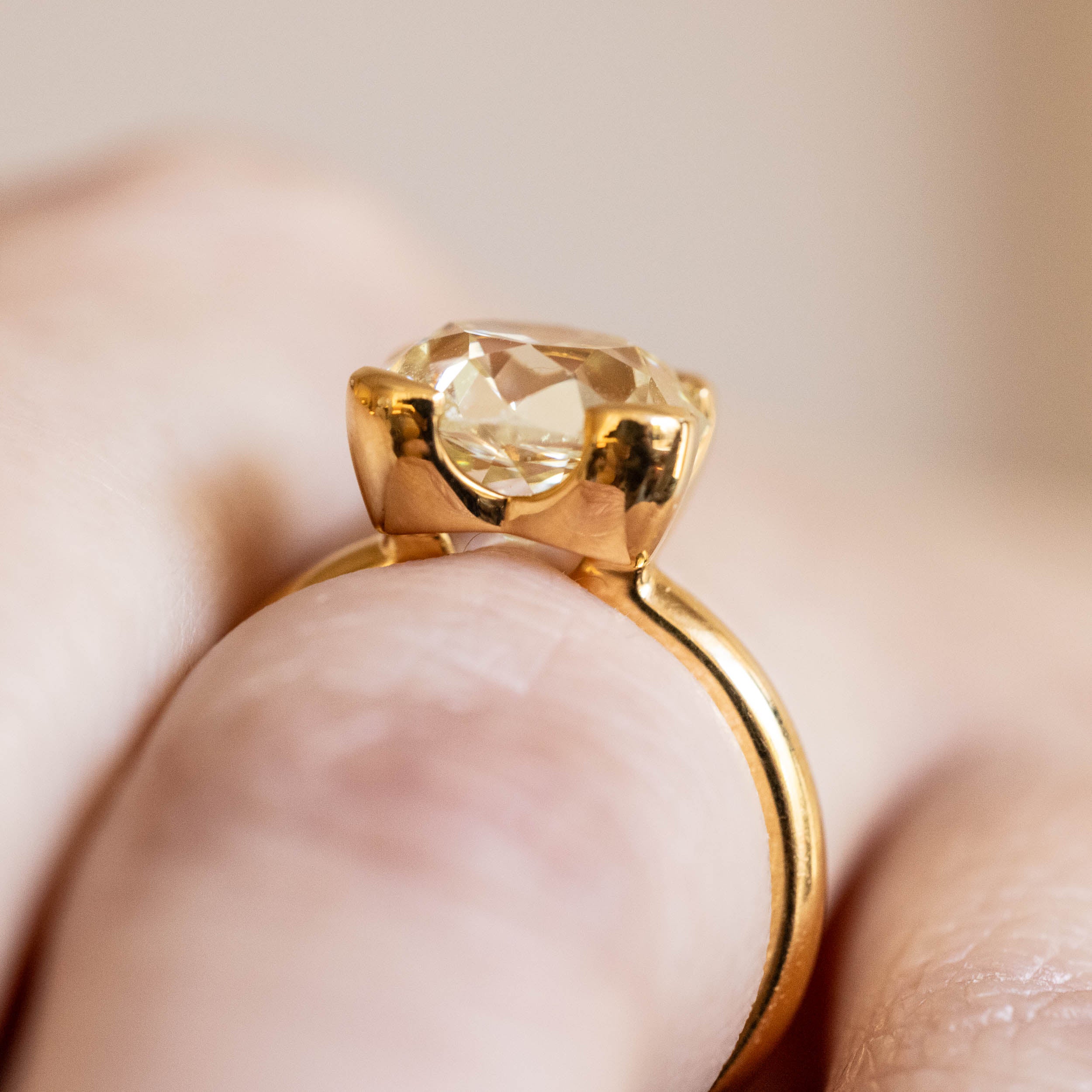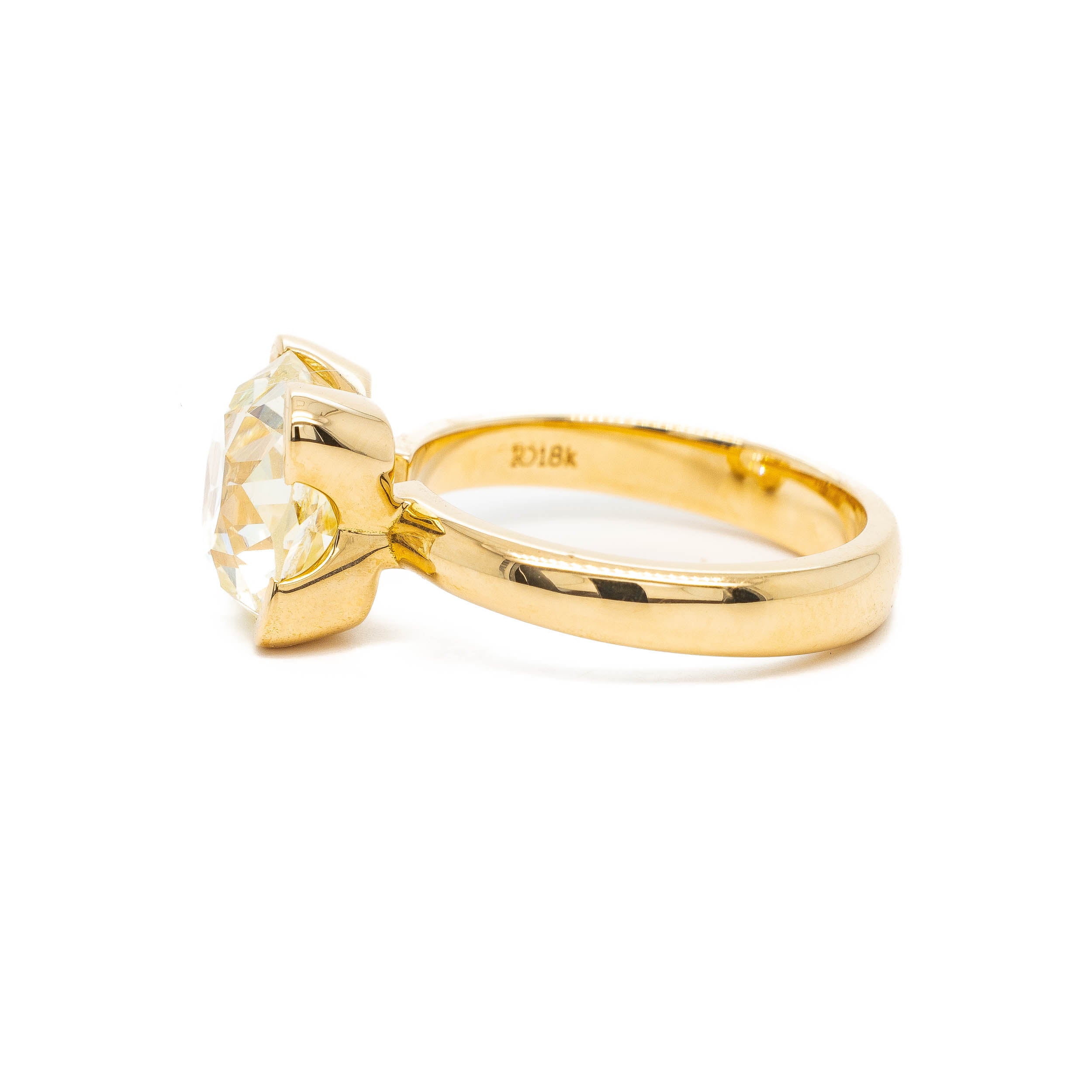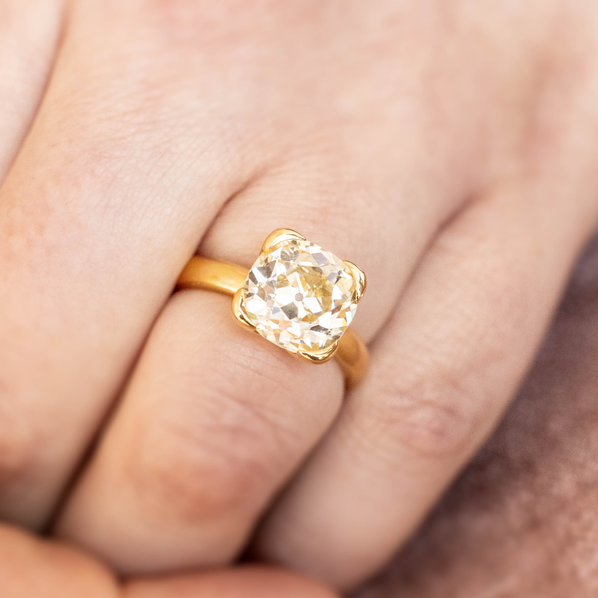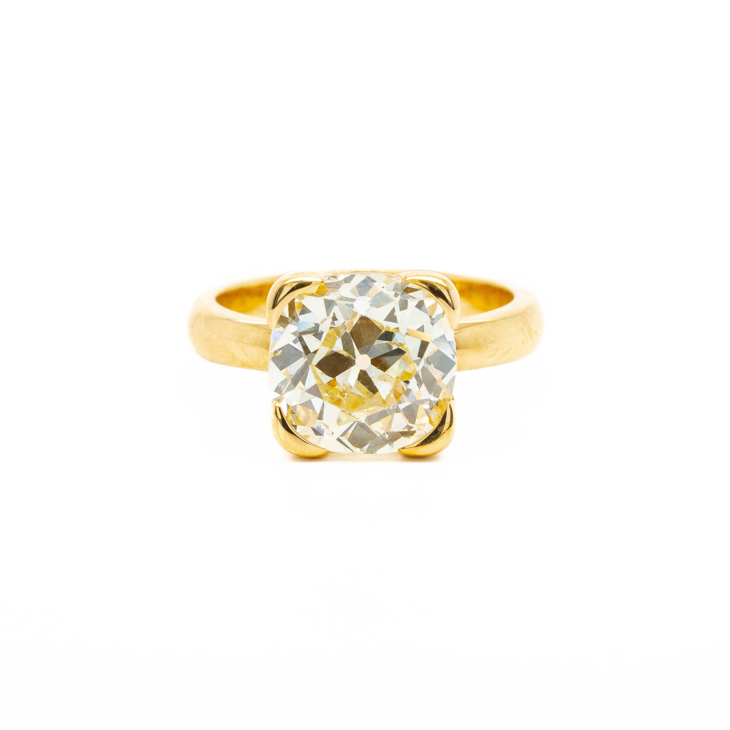 Al Dente means "to the tooth" in Italian, and this cushiony old stone sits solidly low to the finger, making this 4.70ct old mine cut diamond ring. Shaped like a spectacular molar, we love the whimsical "curio-like" and "of another age" feel of the ring with its warm toned antique diamond in glowing 18k. Deep cutouts and a jump underneath the ring maximize the diamonds visibility while sturdy crescent shaped prongs hold the only "tooth" we would like to find beneath our pillows.